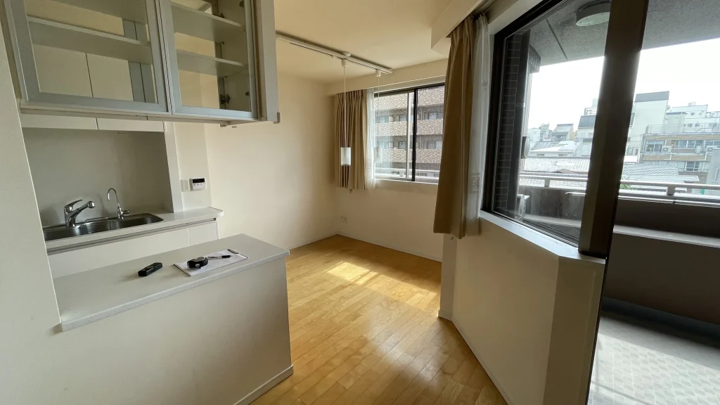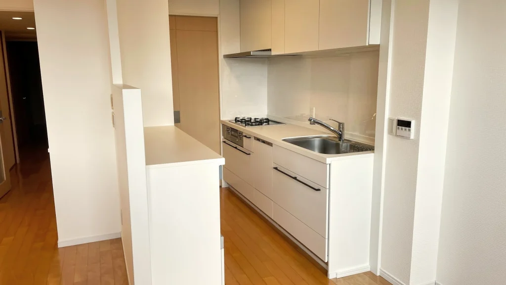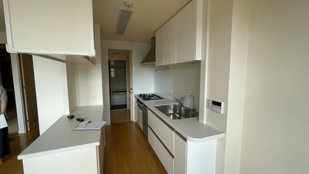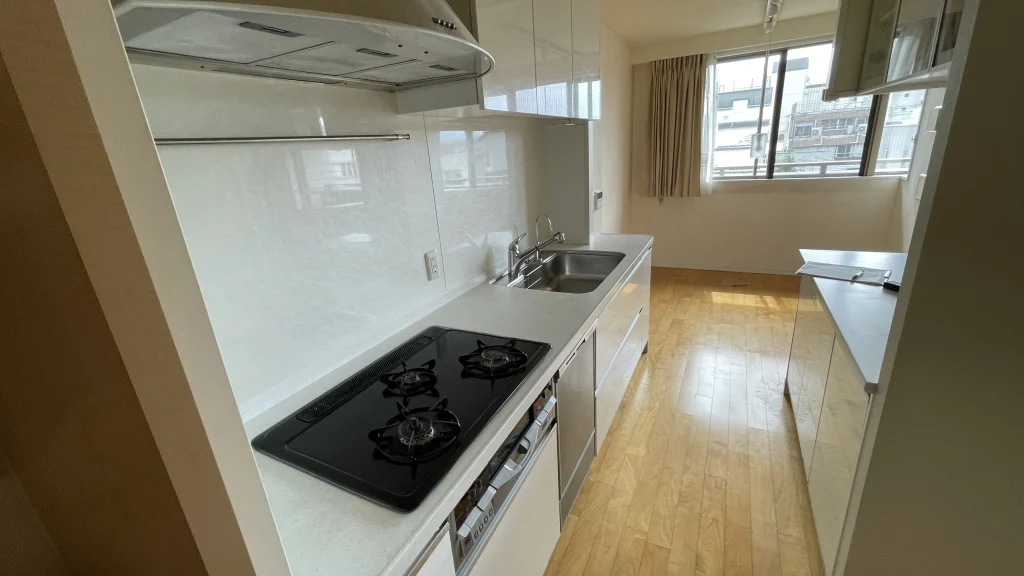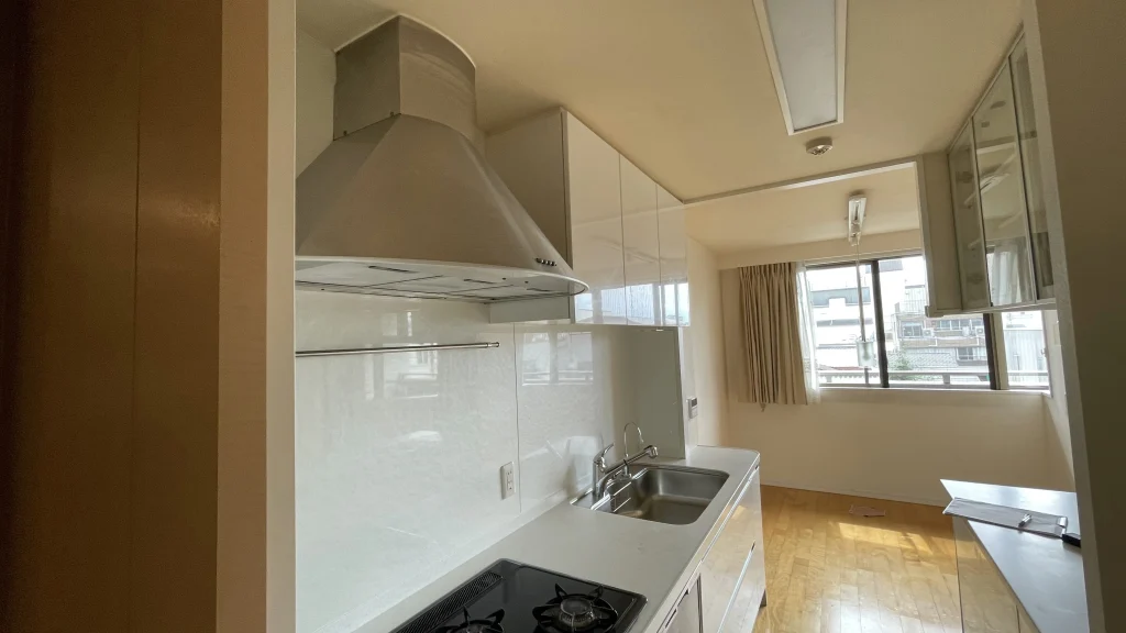 今回のリフォームで吊戸棚は撤去。キッチンが明るくなり、圧迫感がなくなりました。居室側からの見通しも良くなり、開放的なLDKとなっています。