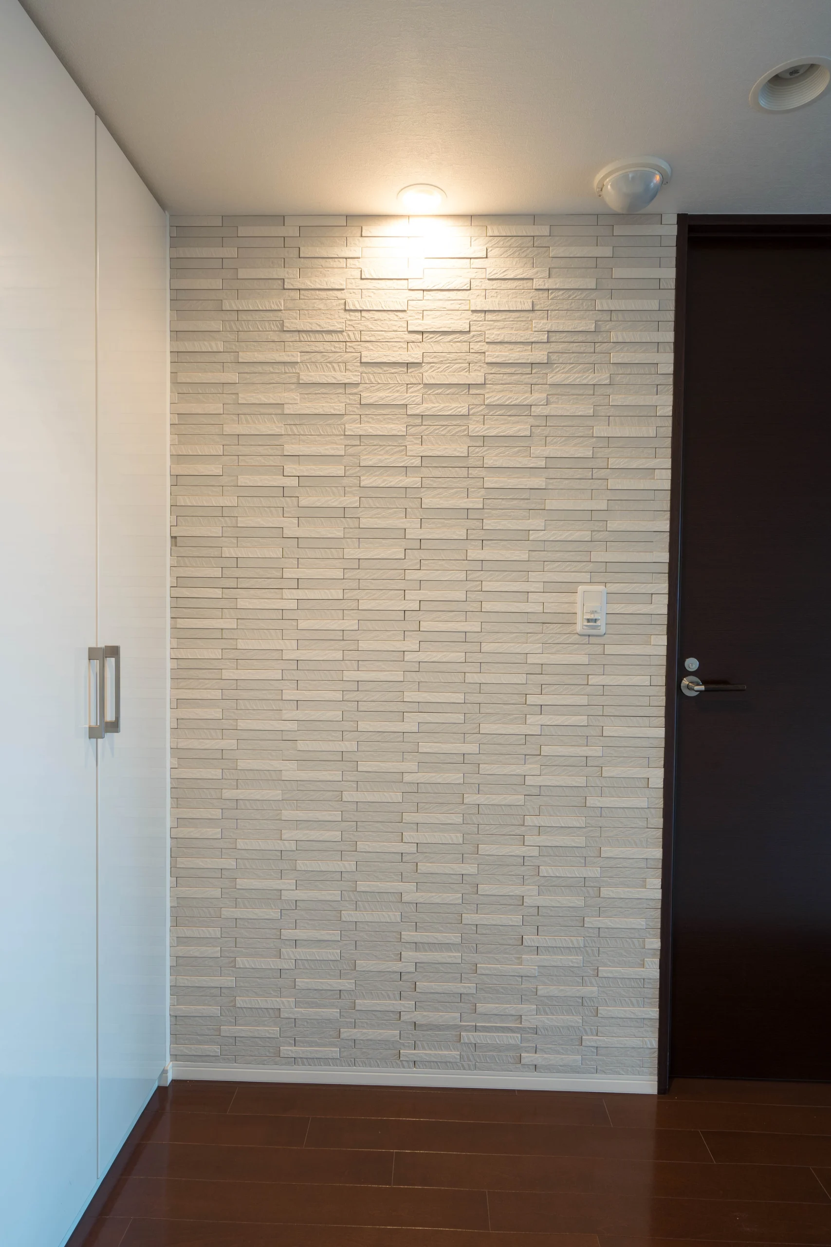 凸凹があった壁はふかして(壁を全面に出して平坦にすること)、エコカラット張りに。玄関もエコカラット張りで高級感のある仕上がりです。