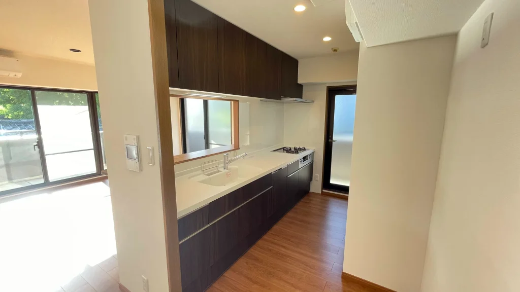 「シエラ」はスタイリッシュなデザインが特徴です。今回は和室の雰囲気にぴったりなスモークドウッド色を選ばれ、落ち着いた印象のキッチンになりました。