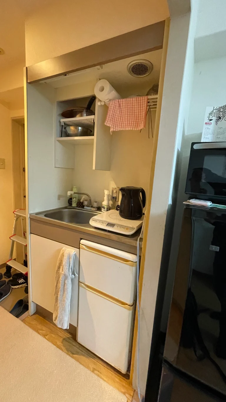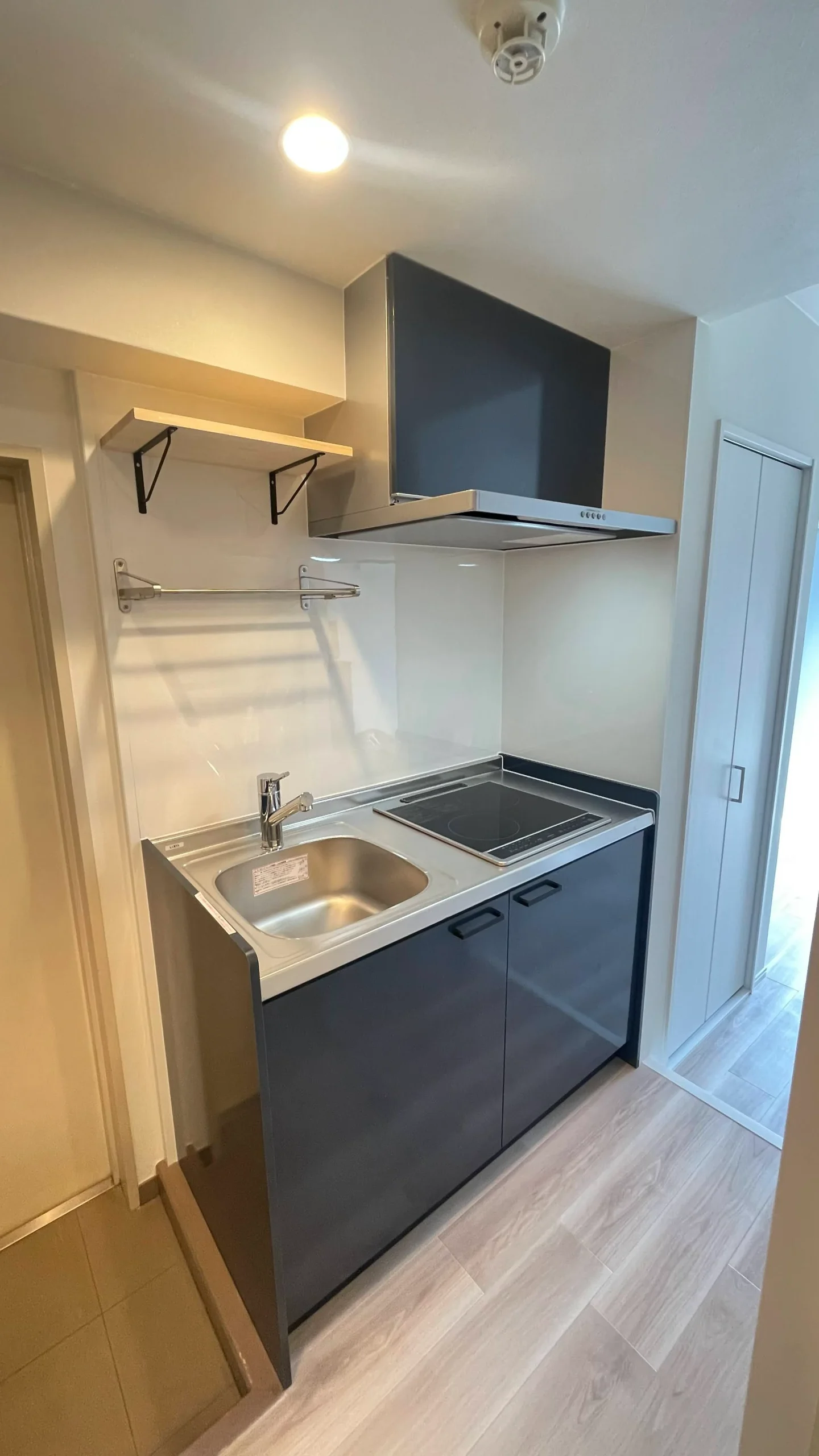 今回ミニキッチンはリクシル「ティオ」を採用。本格的な換気扇により、においを気にすることなく料理ができます。濃いネイビーのキャビネット扉はお部屋のアクセントとなっており、清潔感あるおしゃれなキッチンへと変わりました。