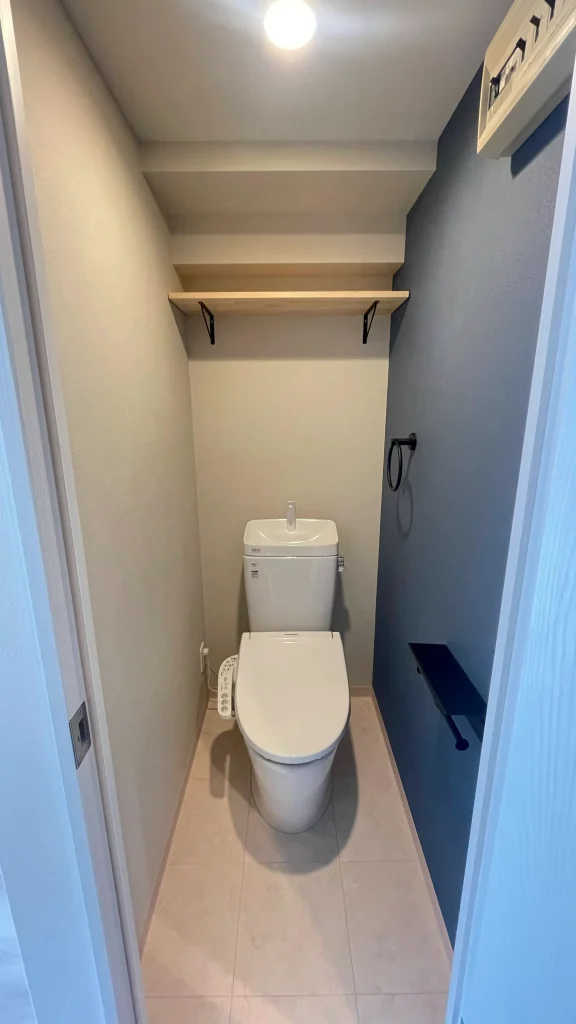 湿気がトイレにこもる3点ユニットバスは浴室とトイレに分離。それぞれを快適に使えるようになりました。トイレ背面の壁には棚を設置。アクセントクロスはキッチンと同系色を使用し、お部屋全体にまとまりが感じられおしゃれな空間になっています。