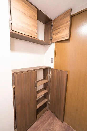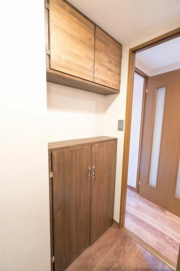 デッドスペースになっていた洗面所のスペースに造作棚を作った事例になります。濃いめの色で塗装することで、アンティーク調に仕上げました。
