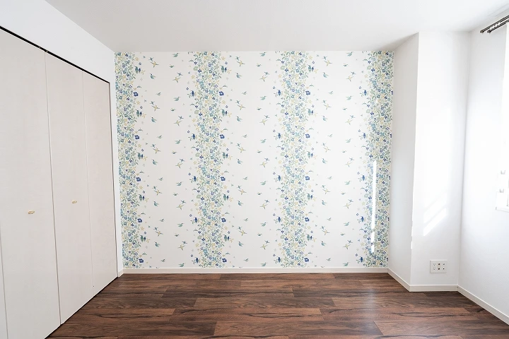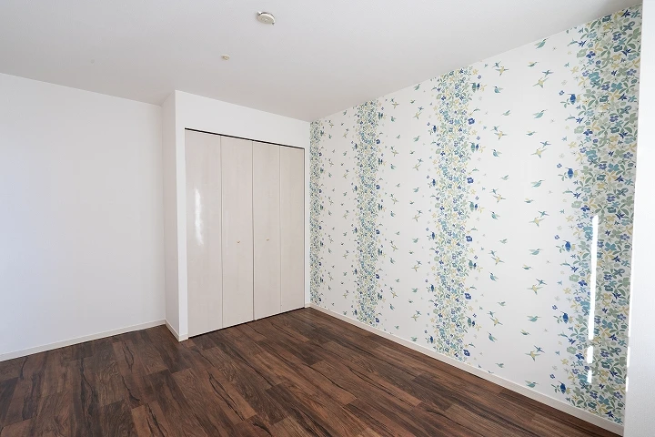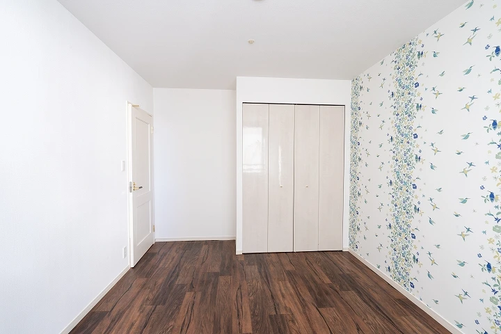 マンションの5畳洋室のフローリングをクッションフロアで上張りしたリフォーム事例になります。壁や天井のクロスも張替え、壁一面はアクセントクロスを入れることで、かわいらしい雰囲気の洋室になりました。