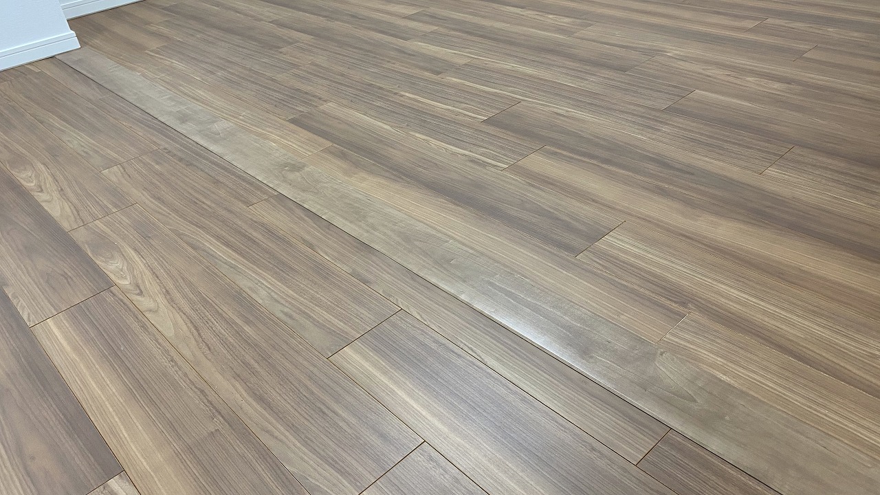 壁があった場所の床には、もともとのフローリング材になじむ色の見切り材を入れたので、2部屋だったことを感じさせません。