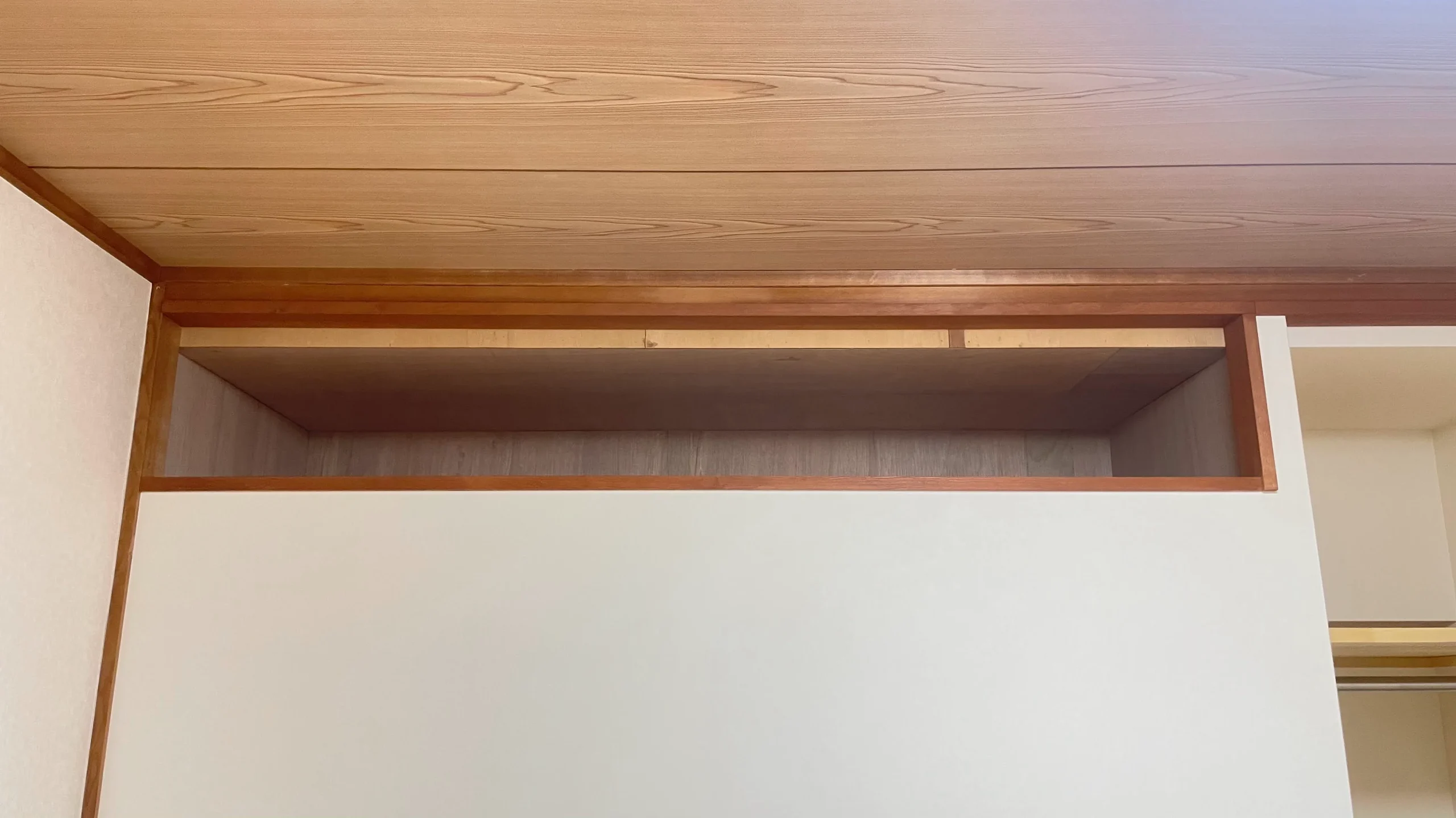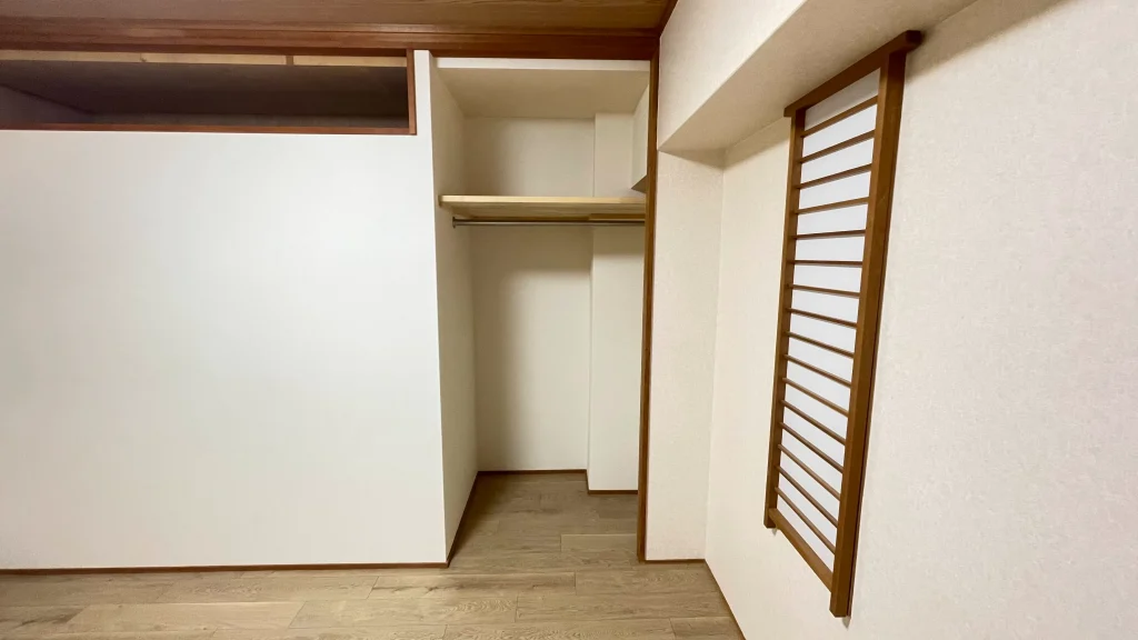 和室側に間仕切り壁をつくり、元押入れの天袋部分を収納に。また棚板やハンガーポールを取り付けた収納部をつくりデッドスペースをなくしました。