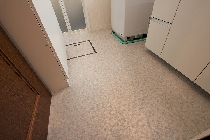 洗面台の交換と合わせて、洗面所のクロスやクッションフロアも張り替えました。クッションフロアは、さわやかなデザインのタイル調のものを選ばれました。