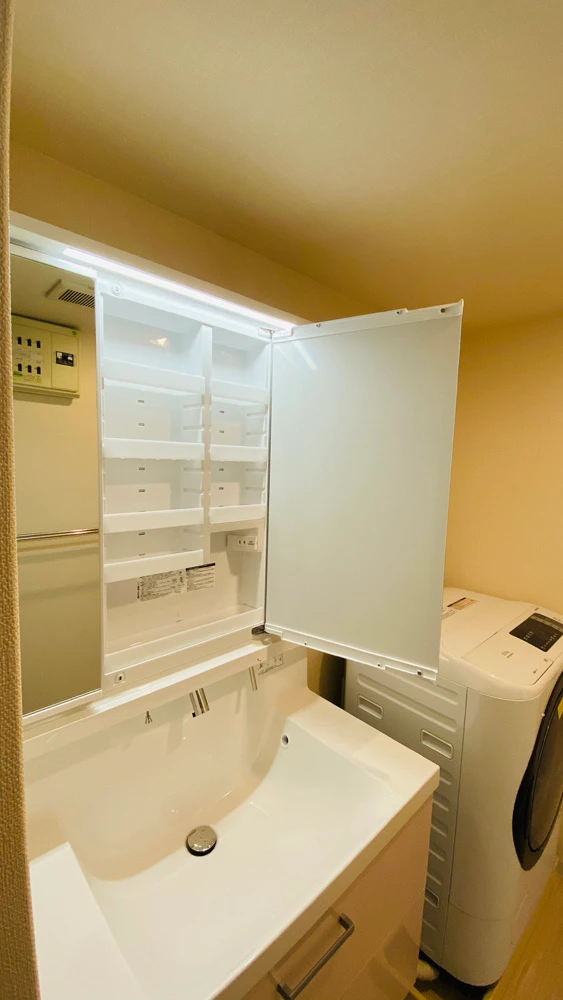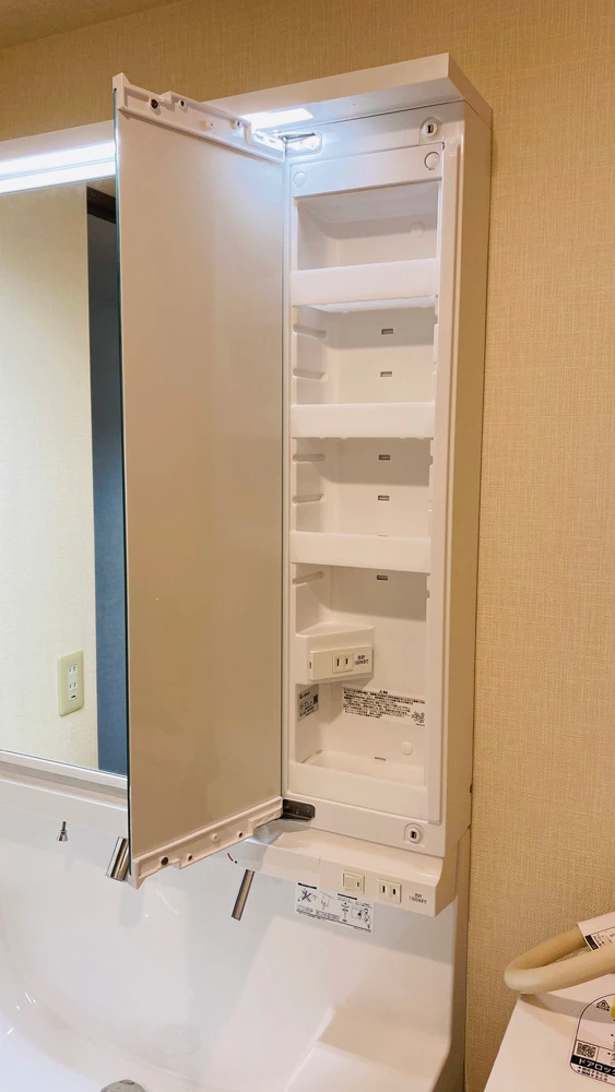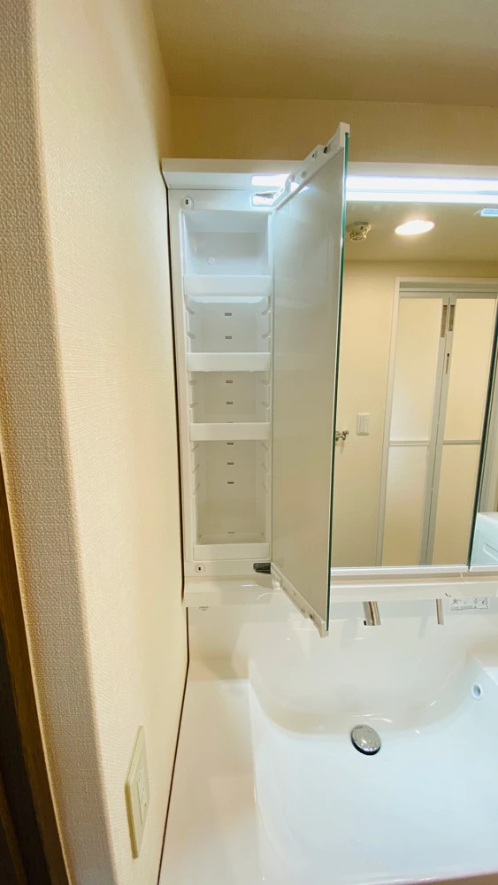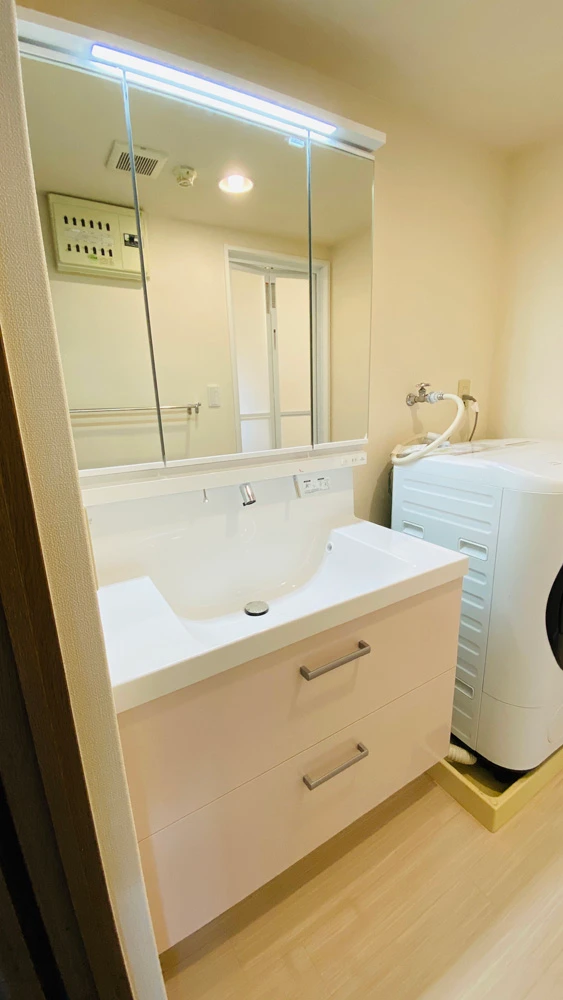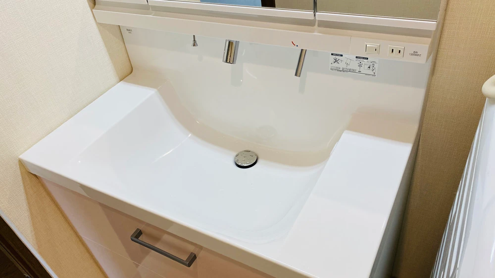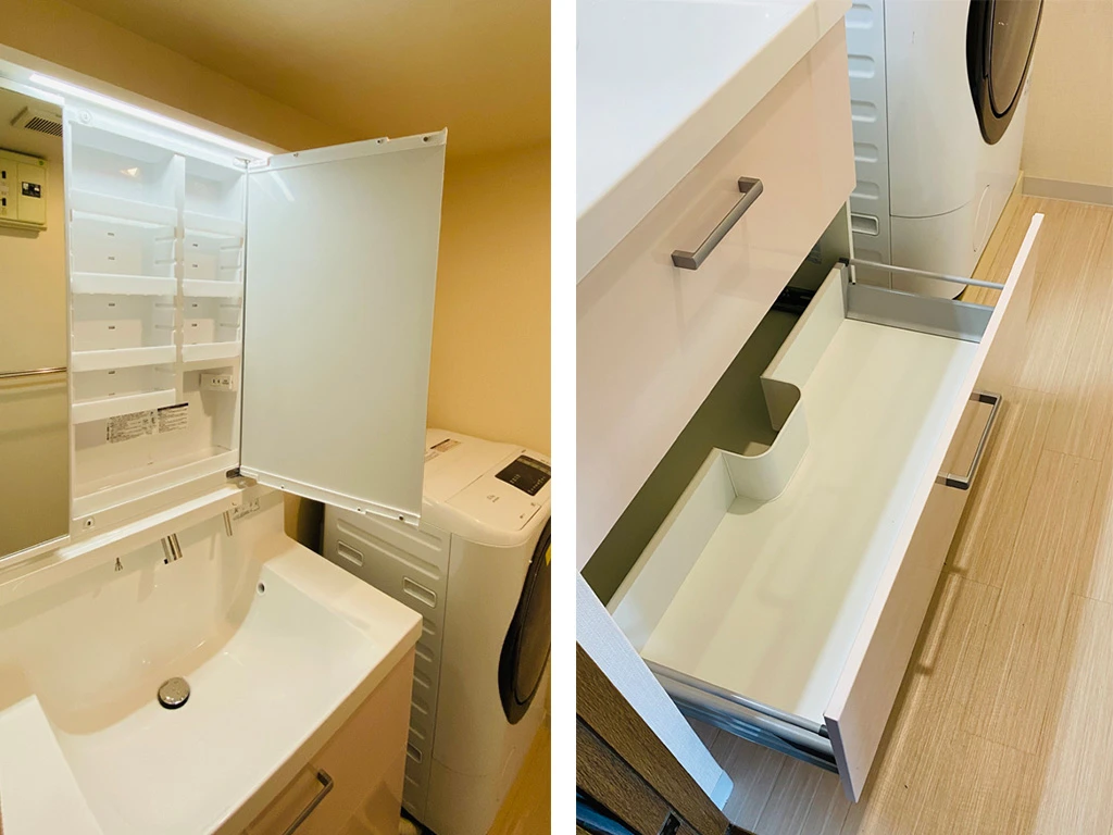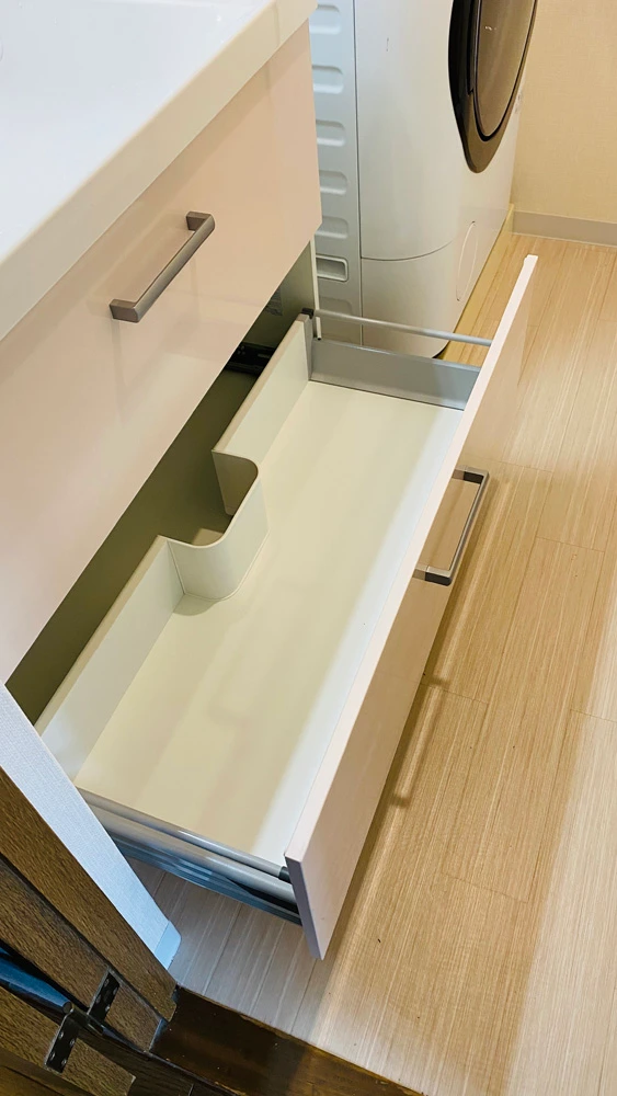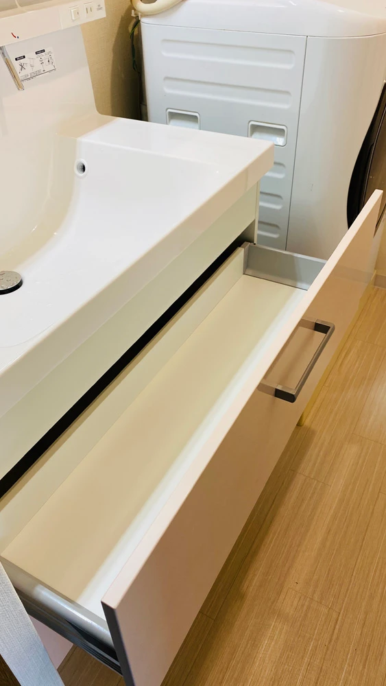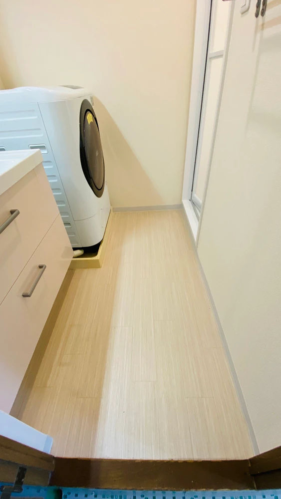 今回は、ユニットバスのサイズアップに成功し、脱衣所の洗面化粧台とクッションフロアの張替え工事を行いました。ユニットバスのサイズアップ成功に加え、脱衣所の洗面化粧台は以前のものよりぐんと収納力アップ。間取り変更工事を行うことなく、これまでよりずっと広々感じられるようになりました。