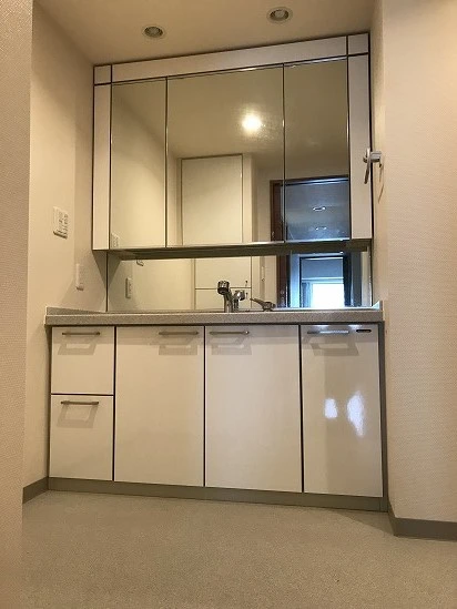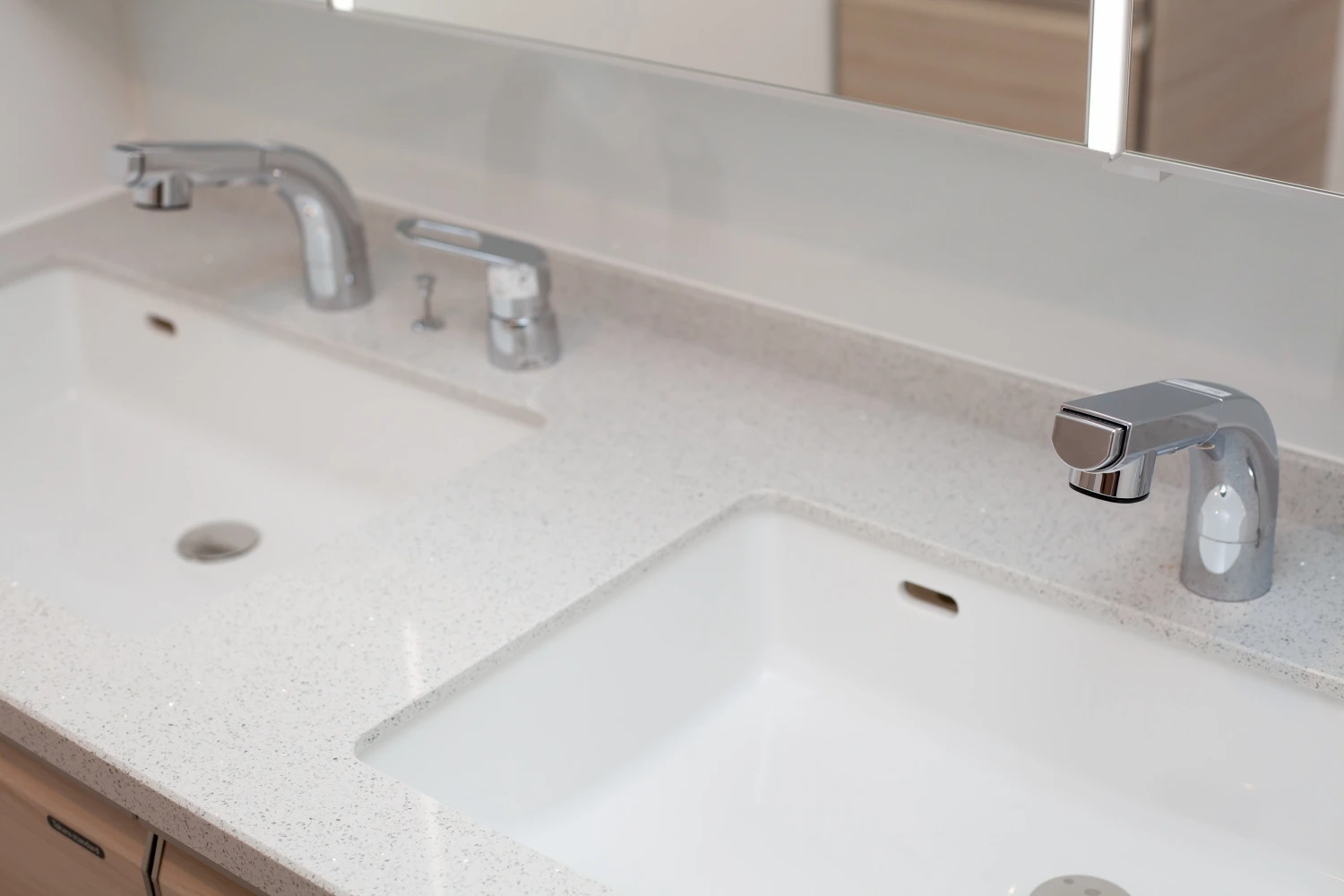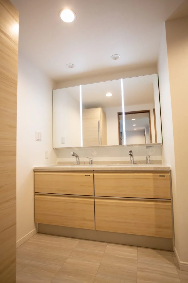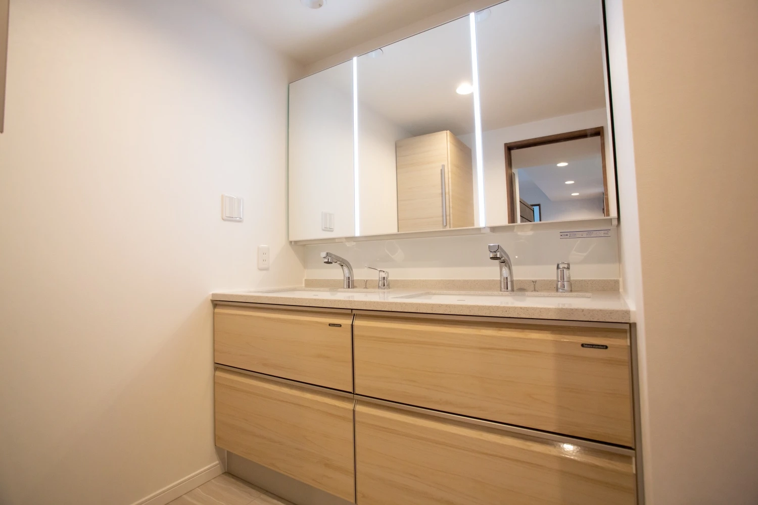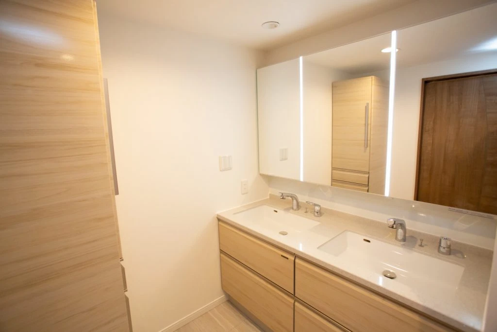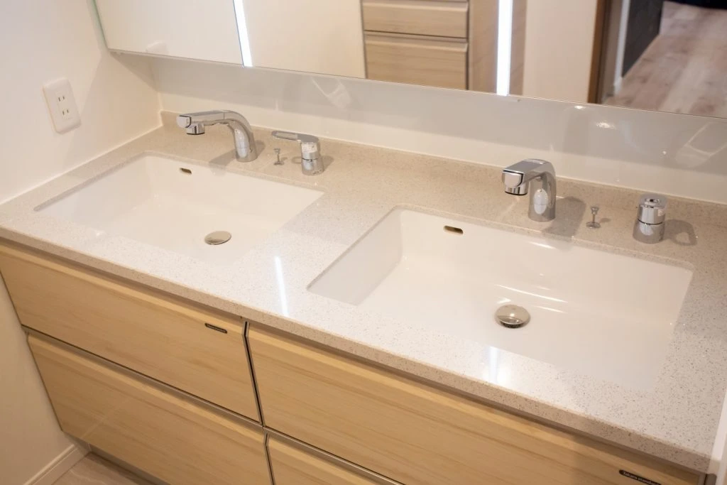 リクシルのハイグレードのユニットバス「スパージュ」と洗面台「ルミシス」へのリフォーム事例になります。CMでおなじみの肩湯などスパージュにしかつけられないオプションがついているほか、壁パネルもタイル調でまるで在来浴室のような高級感があります。一方、洗面台は2つ洗面ボウルが付いているタイプのもので、忙しい朝の時間帯でも、家族でゆったり使っていただけます。