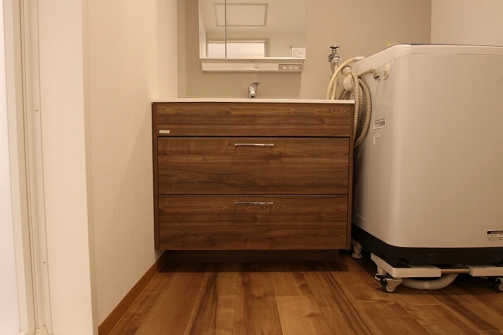 | 主なリフォーム内容 | ・TOTO「サザナ」1216サイズへのユニットバス交換 ・間口90㎝のアサヒ衛陶への洗面台交換 ・作り付けの棚の撤去および天井・床・壁の補修 ・洗面所入り口の開き戸を引き戸へ交換 ・クロス・クッションフロア張替え |