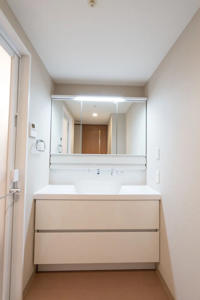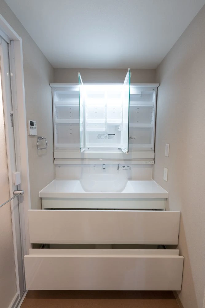洗面台は収納扉のカラーをグレードアップし、グリッターホワイトを選択。高級感のある輝きで、ユニットバスとの統一感を持たせています。