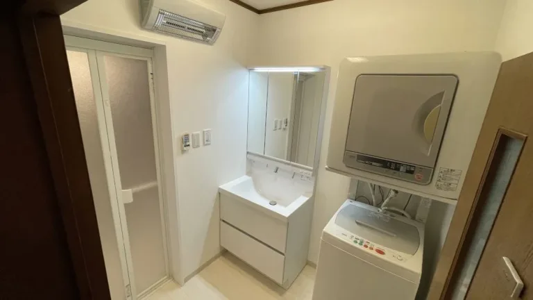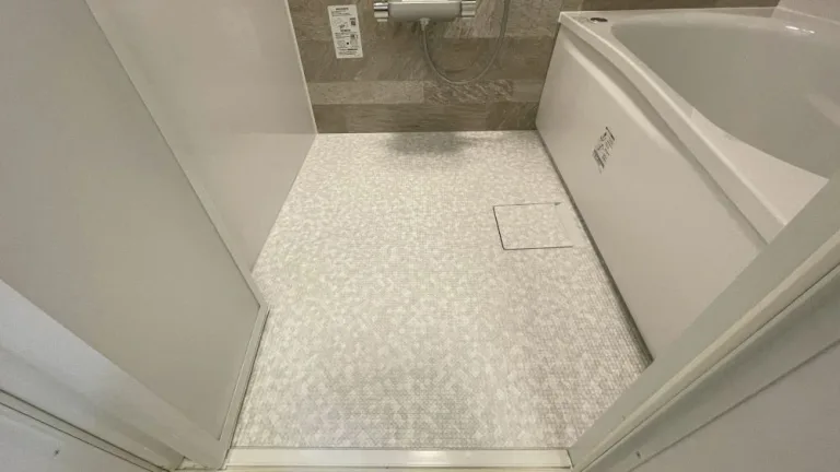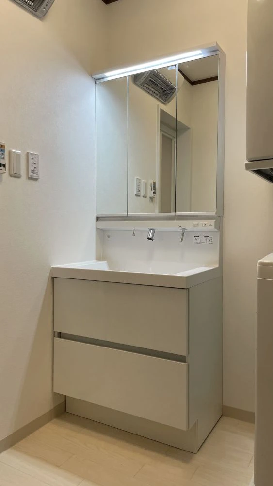 洗面所のクロス・床張り替えと洗面台交換、給湯器の交換も行い、新築のようなお風呂と洗面所に生まれ変わっています。