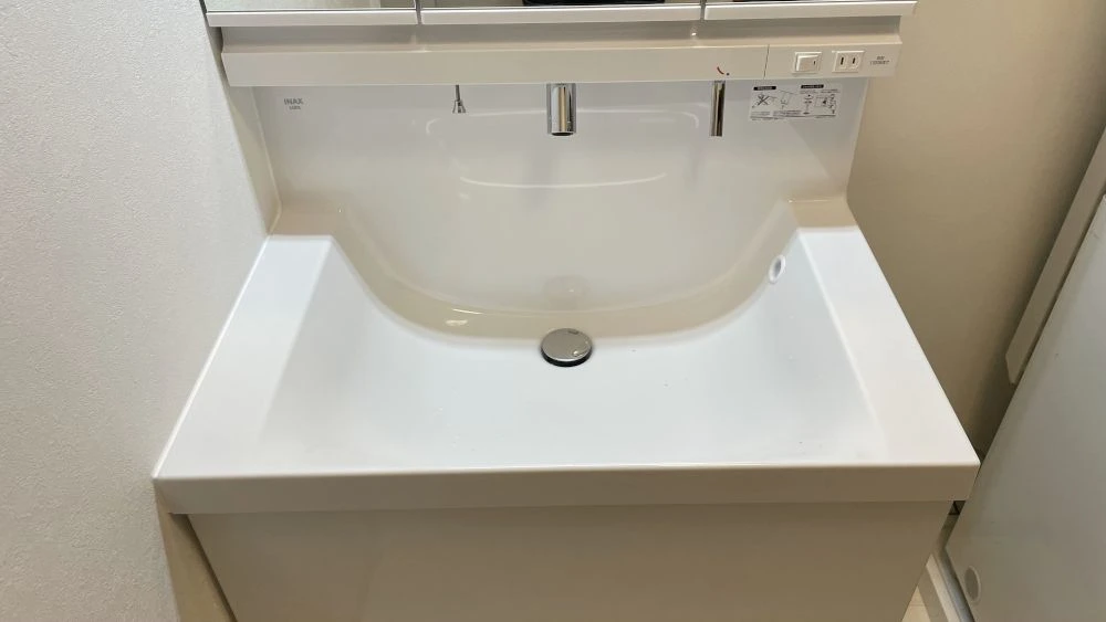 洗面台はリクシルをチョイス。下向きの水栓やひろびろとした洗面ボウルなど、ミドルグレードながら使い勝手が良く十分な機能を備えています。鏡面の後ろも収納スペースになっているので、鏡面が広くなっても収納力はたっぷり。