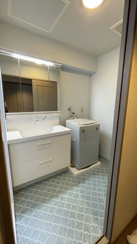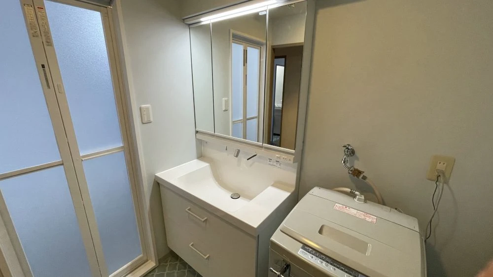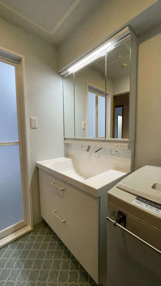 洗面台も収納力があり掃除がしやすいタイプに交換し、洗面所のクロスや床も張り替えています。