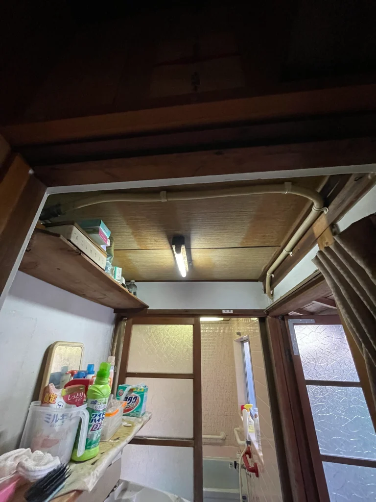 脱衣所は古い木材を撤去し、おしゃれな印象のクッションフロアに張り替えました。古い天井の上にはベニヤを張ってから新しいクロスを張り、照明も交換しました。同じ場所とは思えないほど明るい脱衣所に生まれ変わりました。