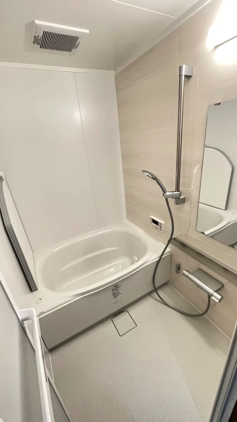 標準仕様の人工大理石「ルフレトーン」の浴槽は高級感ある質感とツヤが美しく、落ち着いた色の壁パネルとよくあっています。
