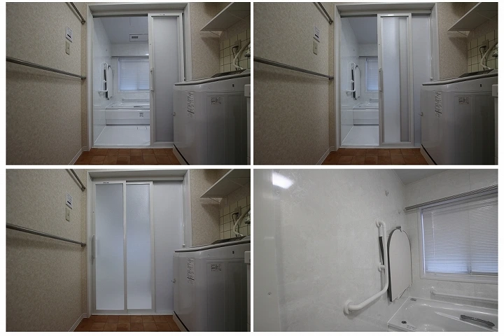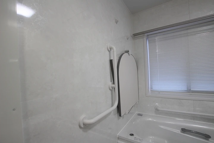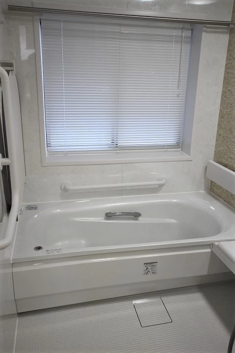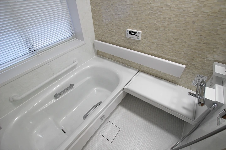ご高齢の両親を迎え入れるため、ベンチ付きのユニットバス「サザナ」にリフォームしました。ご高齢の方でも安心して使えるよう、ベンチ付きで、手すりを伝って浴槽に入れるタイプのものにしました。その他、手すりや、2枚引き戸のオプションを付けるなど、高齢の方が使いやすい工夫が随所に見られます。