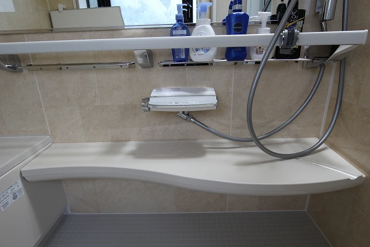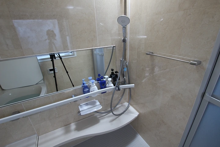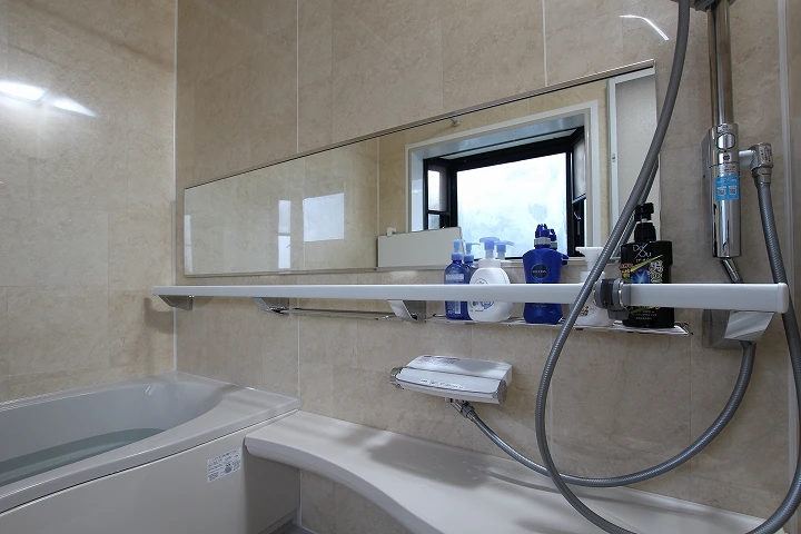 今回、リクシルの戸建て用ユニットバス「アライズ」の中でも最高級のKタイプを提案しました。Kタイプでは、空間を広く見せる横長の鏡や手すりにもなる横長の収納が特長的です。