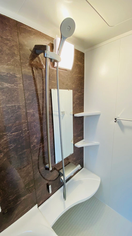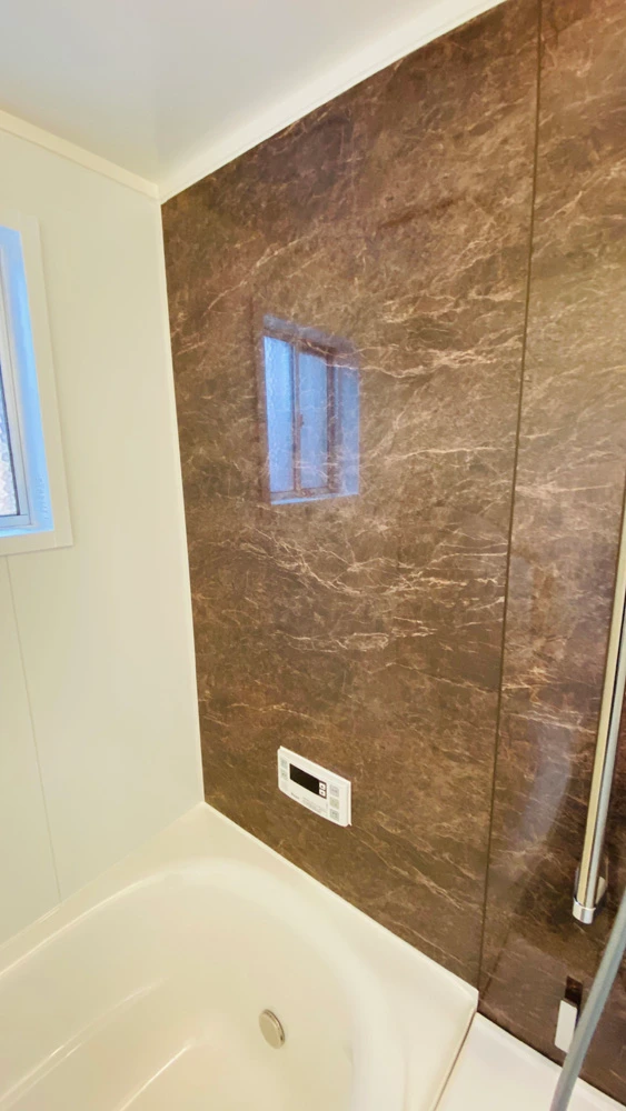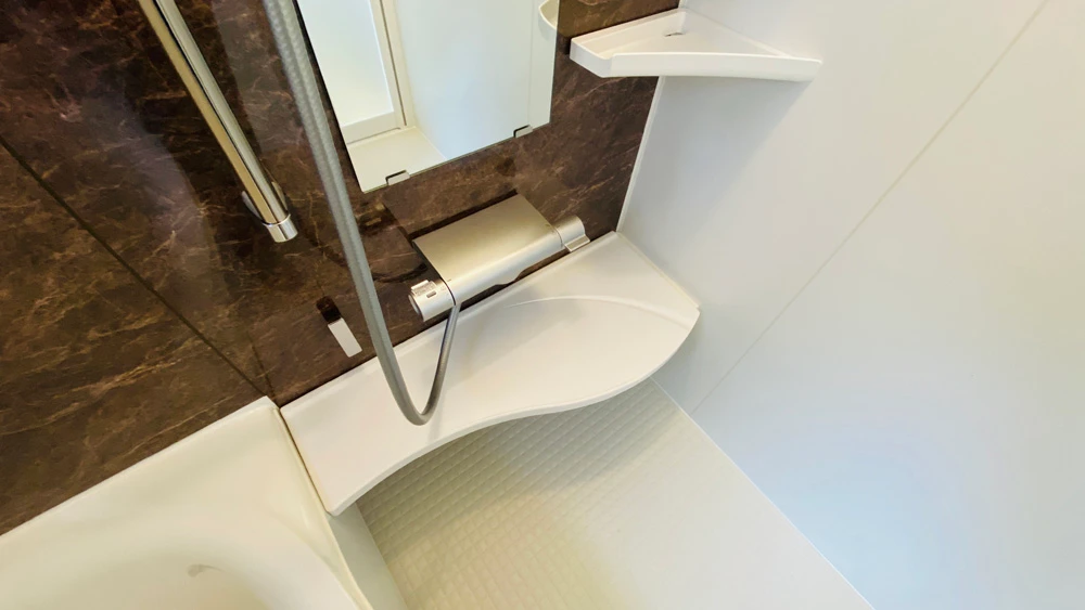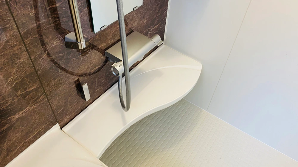 ユニットバスは、リクシルの戸建て用ユニットバス「アライズ」Zタイプでご提案。断熱材の入った浴槽で、冬でも冷めにくいと評判です。また、大きなカウンターが付いており、洗面器も置けて便利です。
