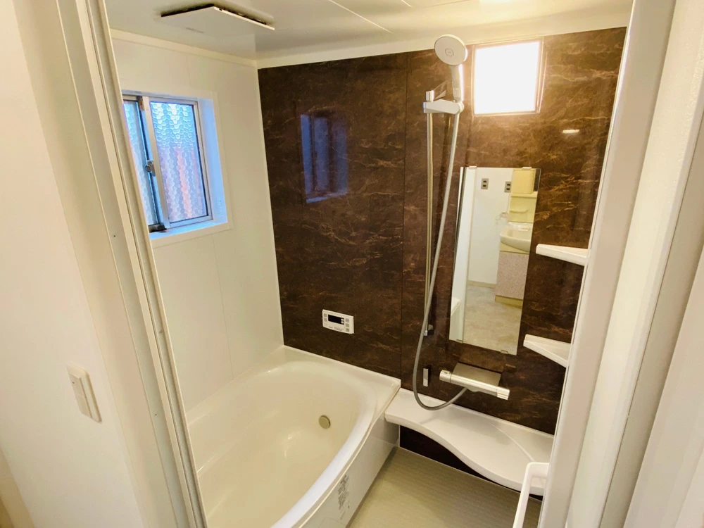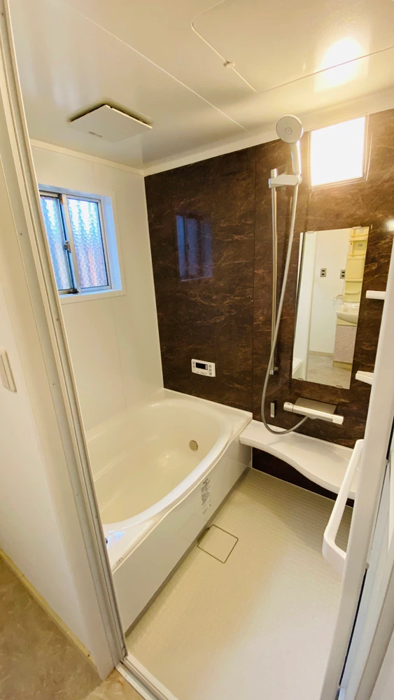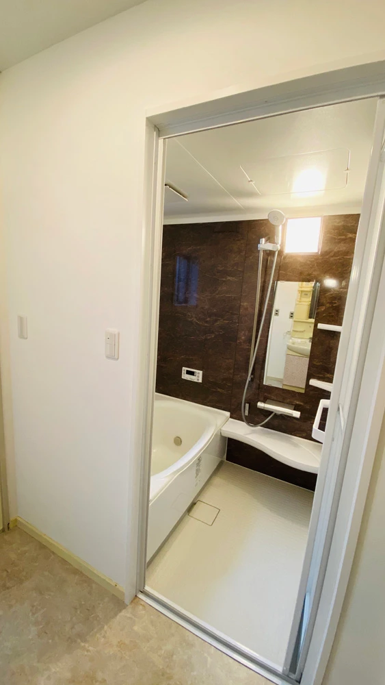 | 主なリフォーム内容 | ユニットバスは、リクシル「アライズ」120㎝×160㎝ ※浴槽幅110㎝から120㎝にサイズアップに成功 ※脱衣所のクロス張替え込み |