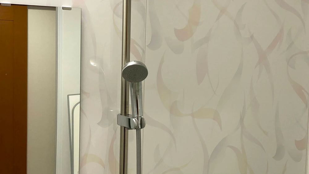 マンションユニットバス交換事例です。リクシル「リノビオV」の壁パネルは豊富で、組み合わせ次第で表情が変わります。今回は華やかながらも清潔感を感じさせる柄をお選びいただきました。