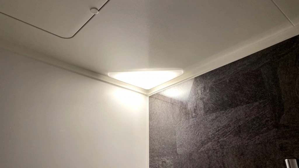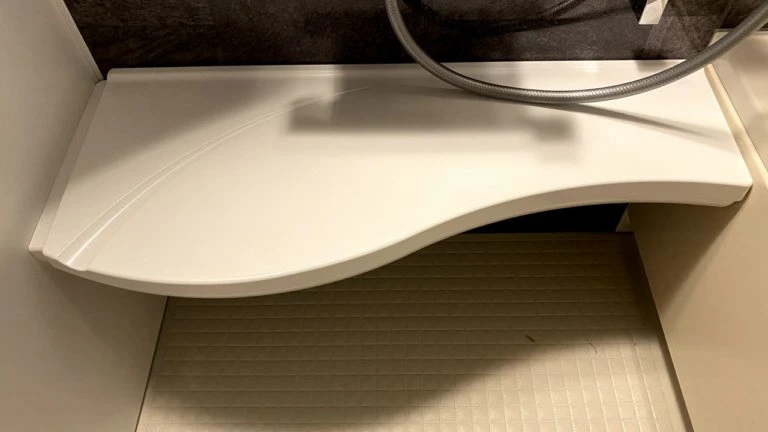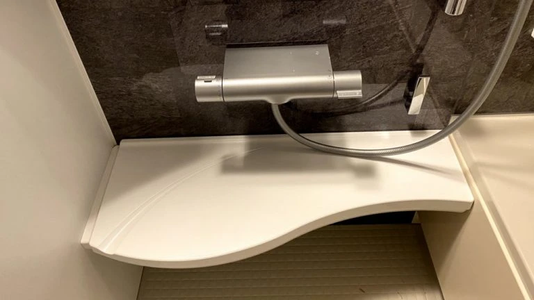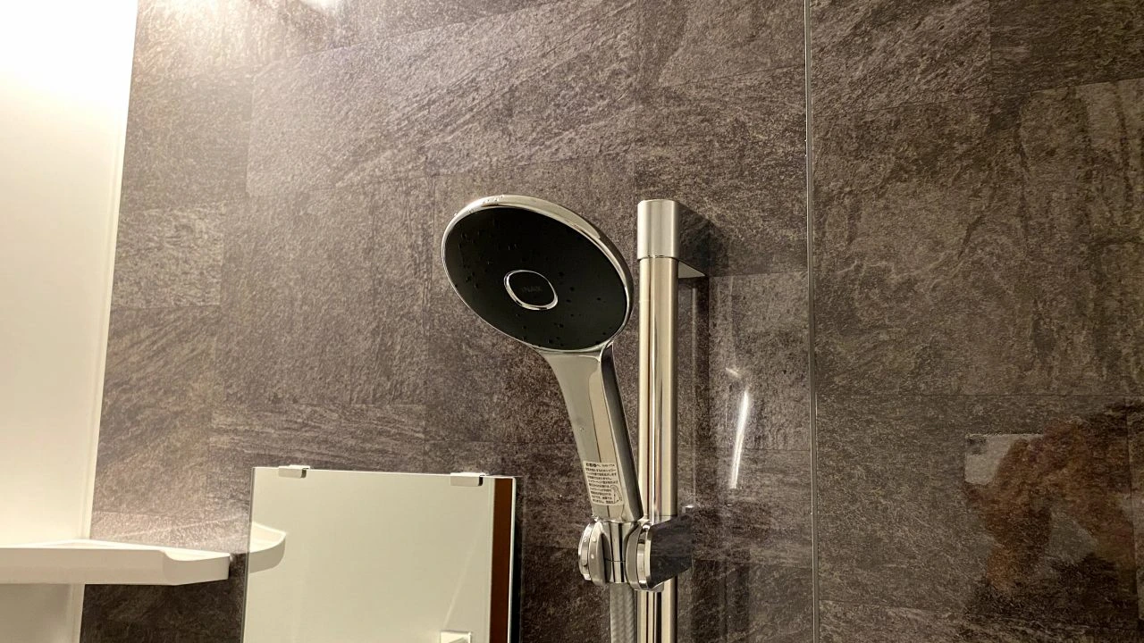 空気を含ませることで節水しながらたっぷりとした浴び心地の両立を実現したシャワーヘッドは、メタリック、ホワイト、ブラックの3つのカラーから好みで選ぶことができます。H様は個性的なブラックを選択。パネルカラーともあいまって、落ち着きと高級感のあるお風呂を演出しています。