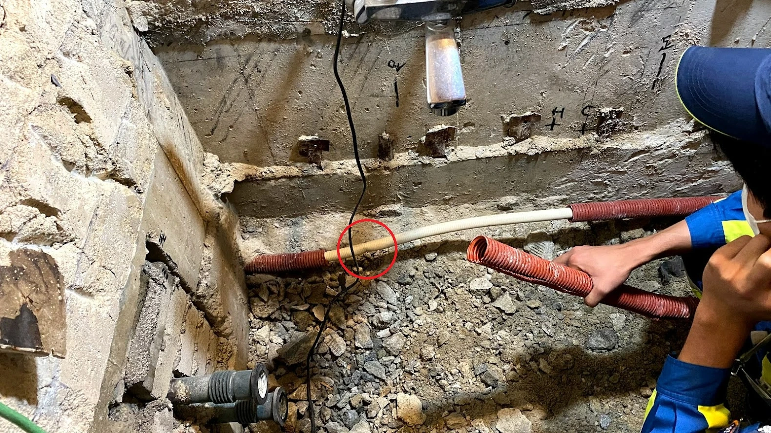 土間に埋まっていたガス配管を誤って、ハツリで突いてしまう
