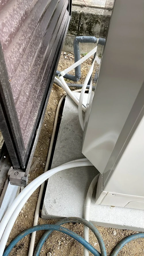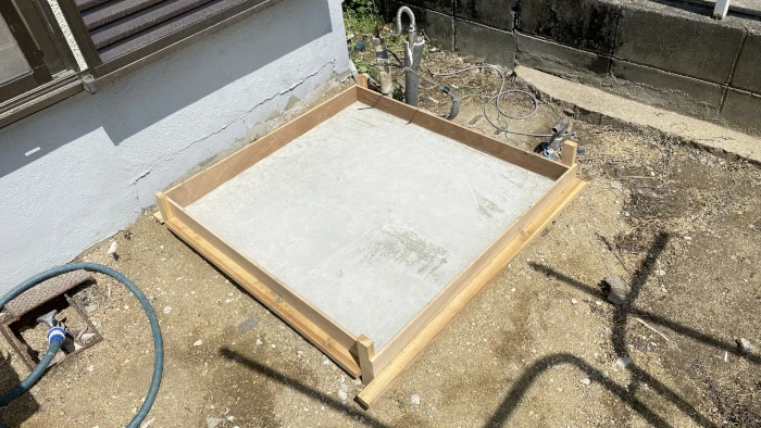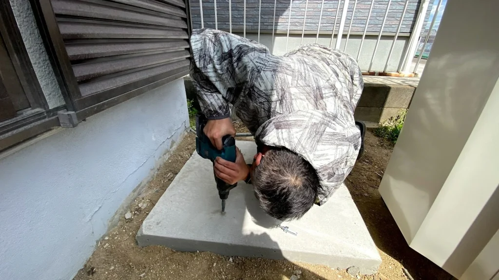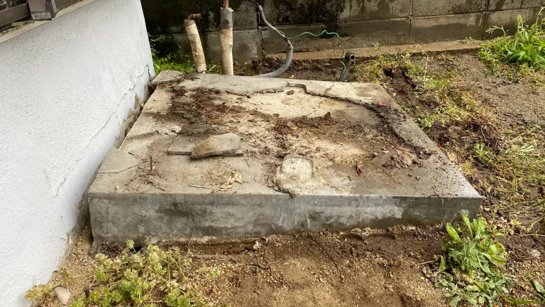 エコキュート設置のポイントは、水平な土台の上に設置することです。T様邸では電気温水器を撤去してみると、コンクリートの土台が斜めに傾いていたため、水平な土台を改めて作り直しました。地味で目立たない工程ですが、トラブルなく機器をお使いいただくために丁寧に作業しました。
