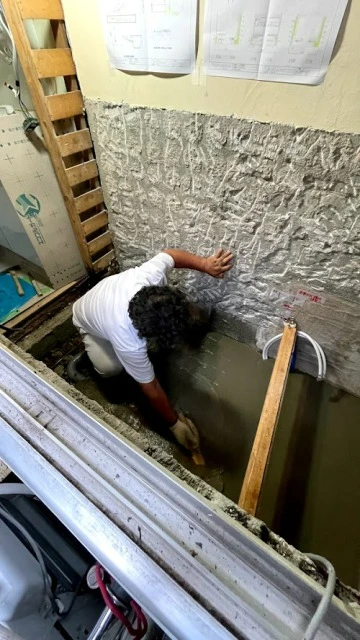 高級感のあるステンレス浴槽は、バスルームのカラーリングに合う色をチョイス。保温材をぶ厚く吹き付けてあるのでお湯も冷めにくくなっています。