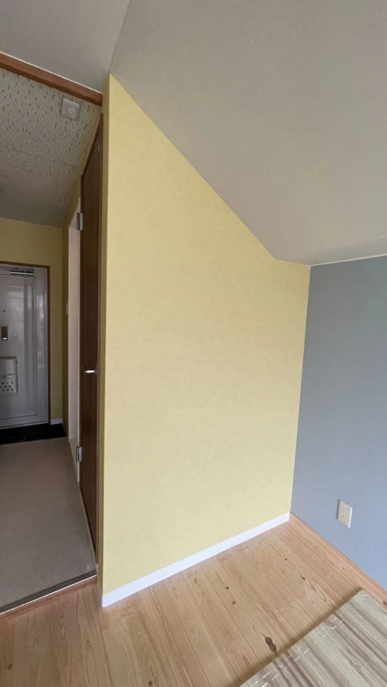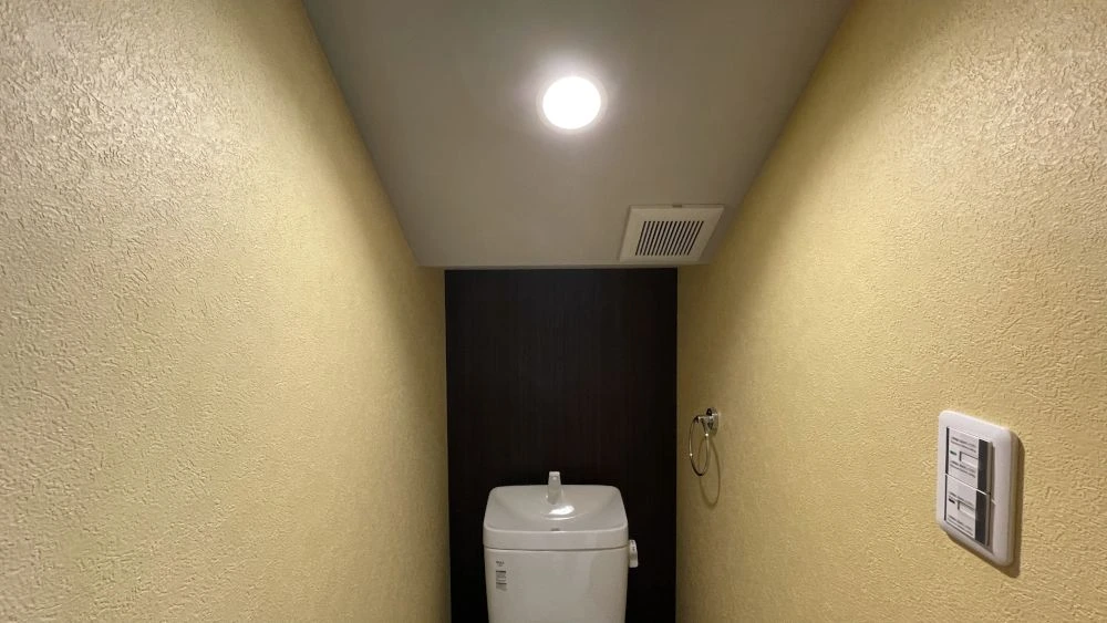 天井が斜めの収納スペースを新しくトイレに改装しました。天井が低い奥側はタンクがあるため、天井が低くてもあまり不便はありません。濃色のアクセントクロスで奥行き感を出しています。
