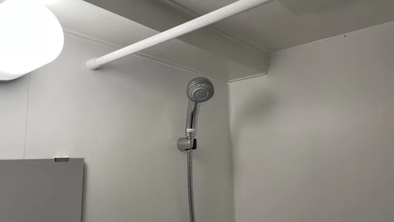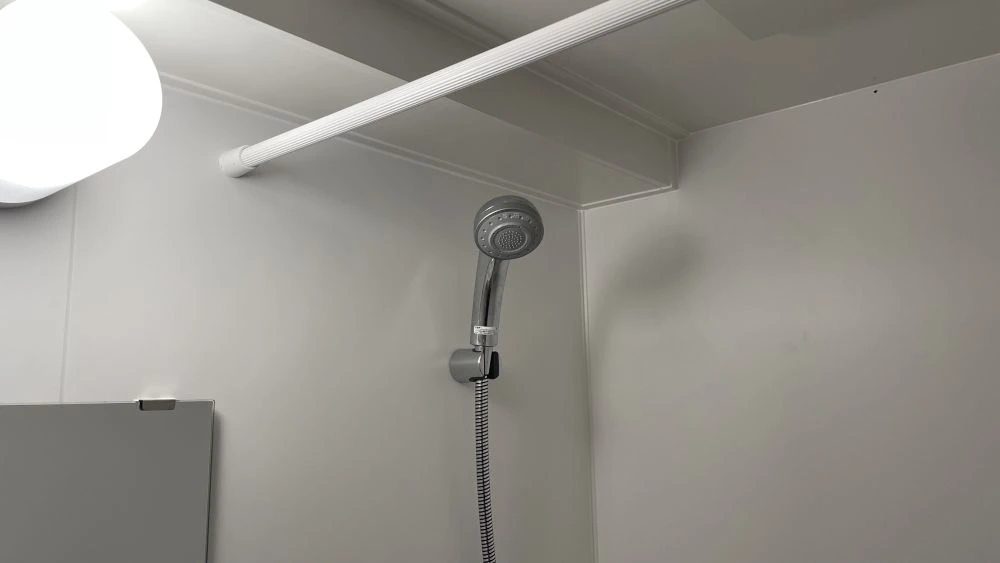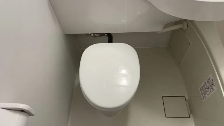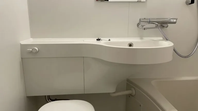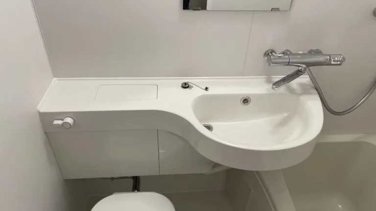 トイレのタンクと洗面が一体化した造作で、凸凹がなくなってすっきり見えます。シャワーヘッドや水栓もメタリックになり、グレードがアップした印象です。