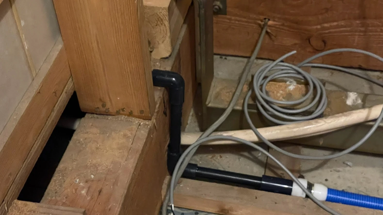ユニットバスのパンと給排水が干渉するため、解体後に移設が必要と判明。 画像は、給排水仕込み工事後。