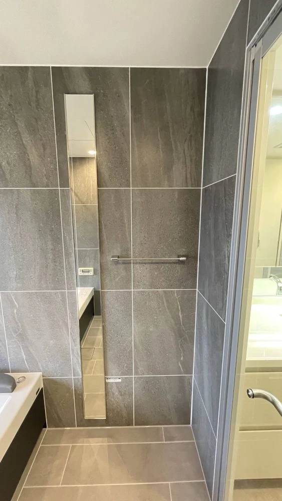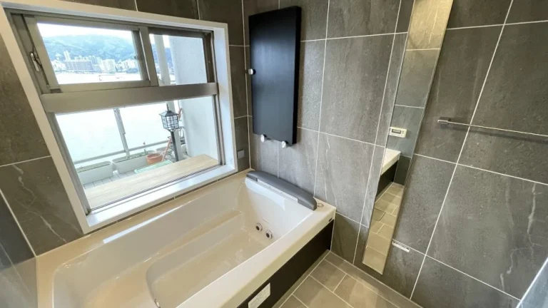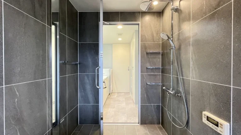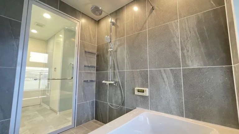 壁や床は耐久性が高く汚れが付きにくいセラミック製で、石目調の質感がバスルームをラグジュアリーな空間にしています。
