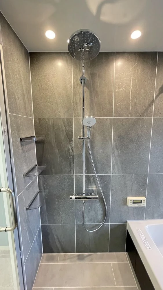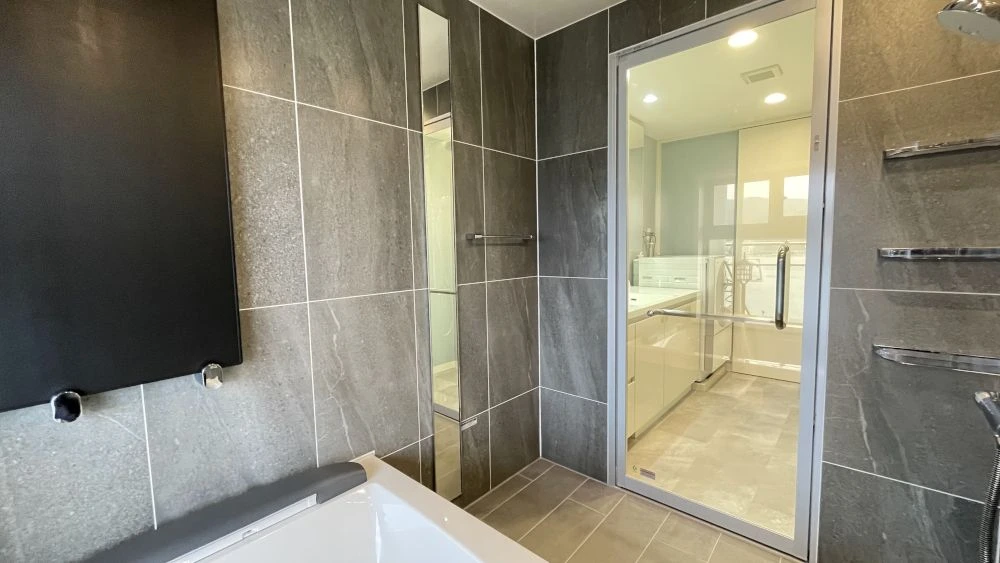 石目調のタイルが浴室に高級感を添えています。
