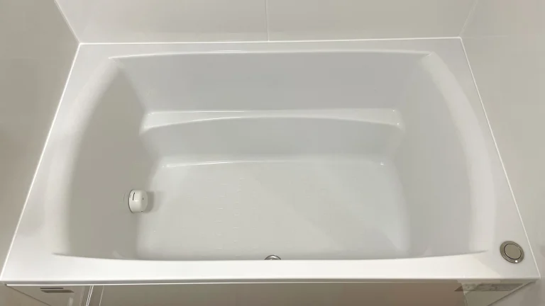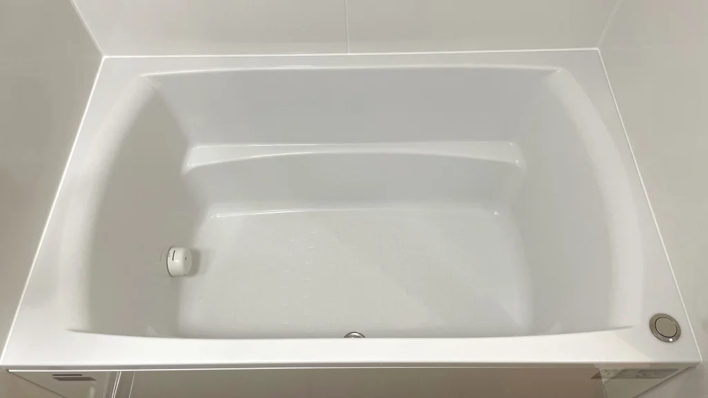 アクリル人造大理石の「キープクリーン浴槽」は、大理石のような光沢と肌触りが特徴で、セミスクエアのデザインがスタイリッシュな印象です。