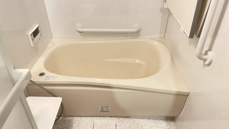 TOTOの人気ユニットバス「サザナ」。アクセントパネルはホワイト、浴槽はベージュを選ばれ、清潔感のある空間へ。