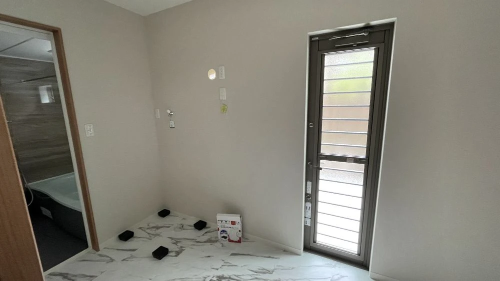 戸建ての洗面所にガス式衣類乾燥機「乾太くん」を設置した事例です。乾太くんの設置に必要なガス配管工事と排気ダ...