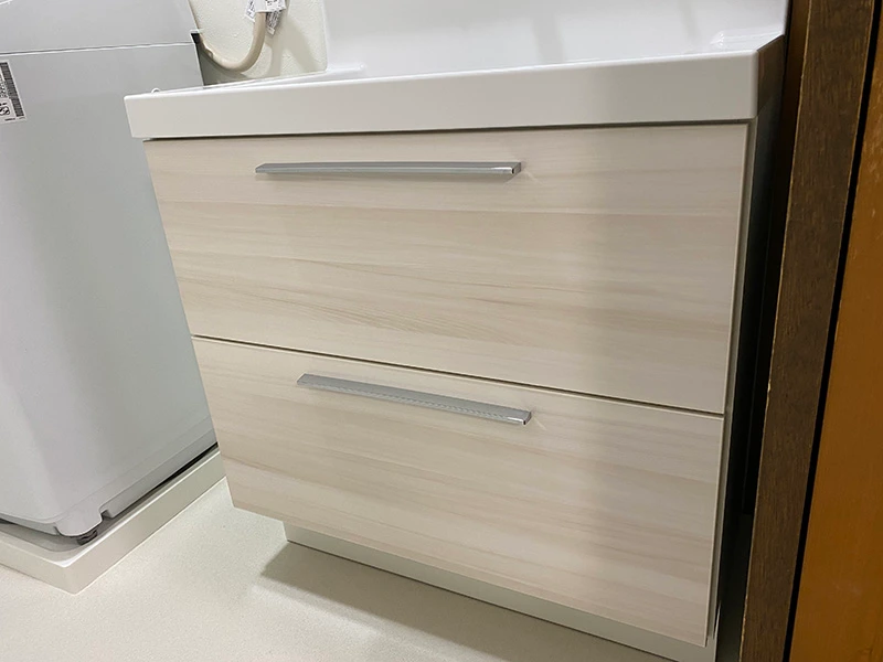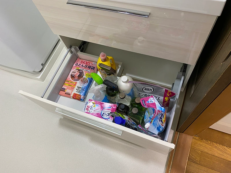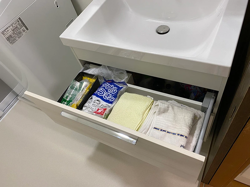 LCではフルスライドタイプの収納を選択しました。2段の引出しになっており、奥行きも深さもあるので、タオルや掃除道具など必要なものは全て収まったとご満足いただけました。