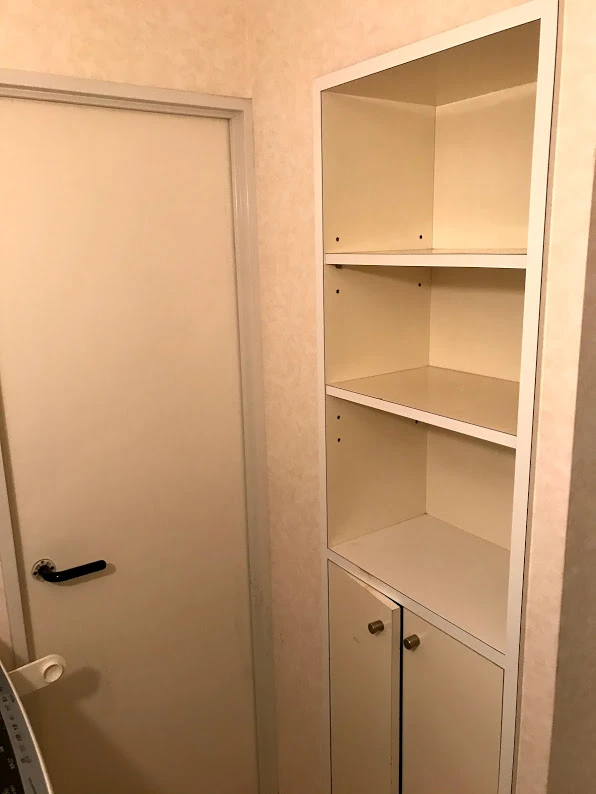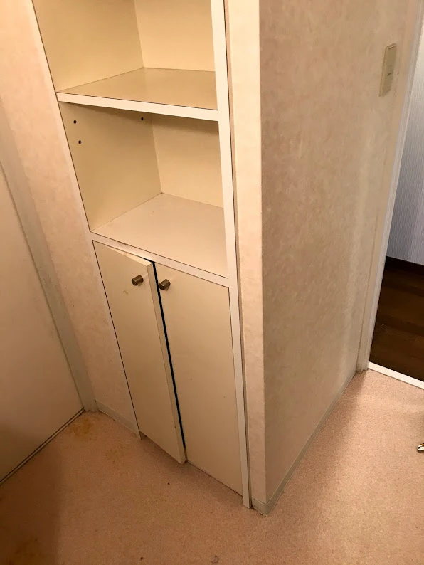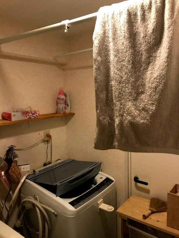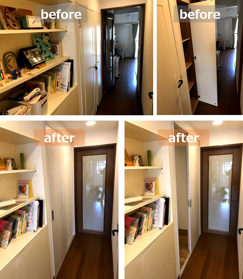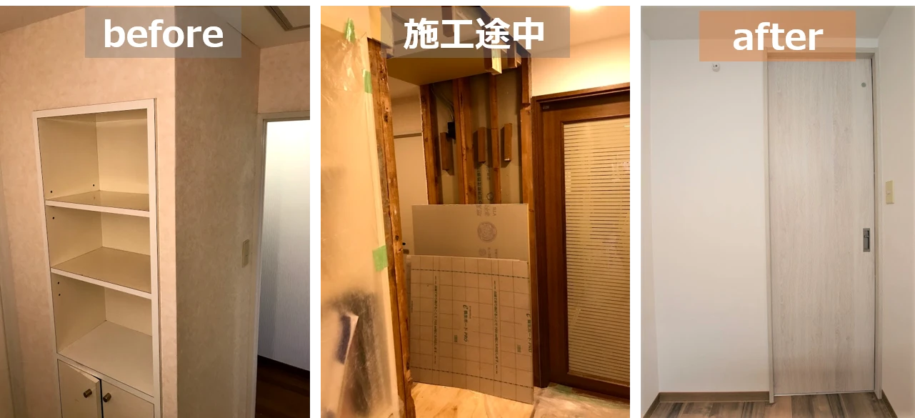| 主なリフォーム内容 | ・アサヒ衛陶の洗面台幅90㎝へのリフォーム ・作り付けの棚の撤去と、それに伴う天井や床、壁の補修 ・開き戸から引き戸へのリフォーム ・クロス・クッションフロア張替え |