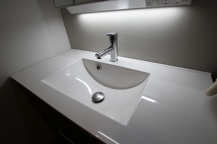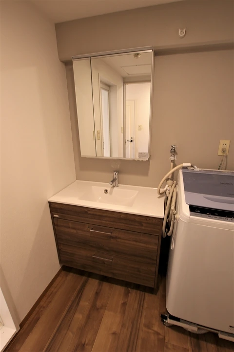 洗面台はお客様お気に入りのアサヒ衛陶の洗面台間口90㎝のものにしました。鏡と洗面「台」が分離しており、オーダーメイドのような質感の洗面台になります。