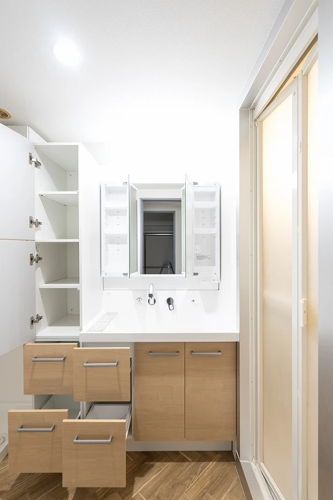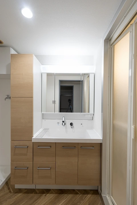 もともと洗濯機置き場があったスペースを工夫し、幅30㎝のトールキャビネットを置けるようにしました。ハンドタオルなども収納できるようになったとお客様に喜んでいただけました。