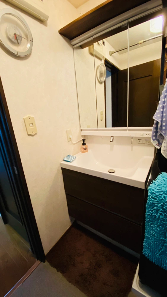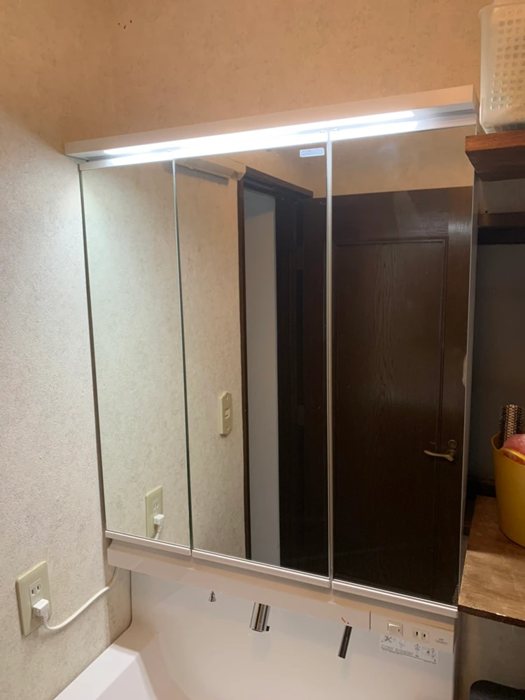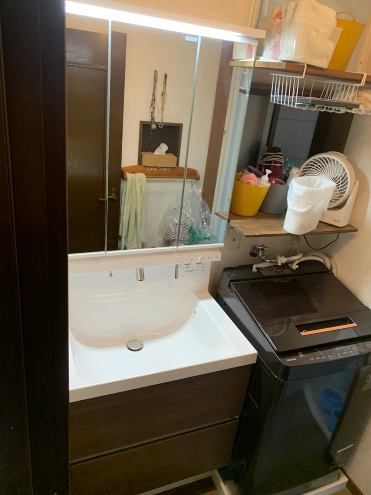 三面鏡で、フルスライドの二段引き出しタイプの洗面台をご提案。収納量が豊富で、散らかりがちだった洗面所も全てきれいに整理整頓できたとお客様も大喜びでした。