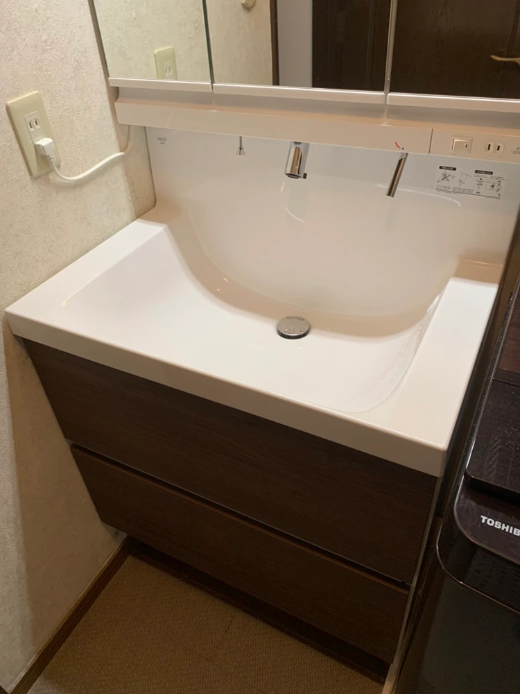 | 主なリフォーム内容 | ・リクシルの幅75㎝/引出しタイプの洗面台へのリフォーム ・洗面台設置のために、大工工事により床上げ |