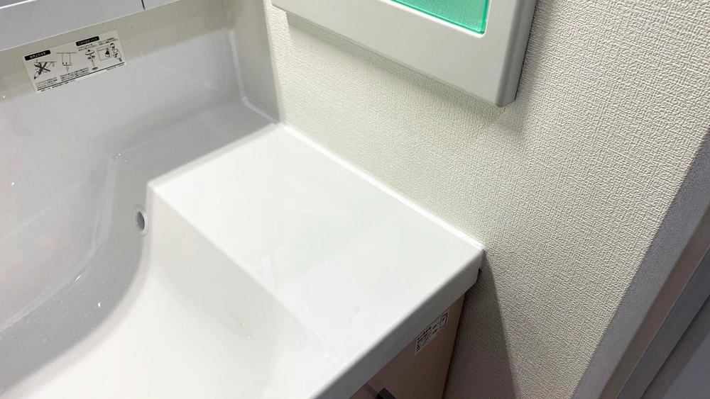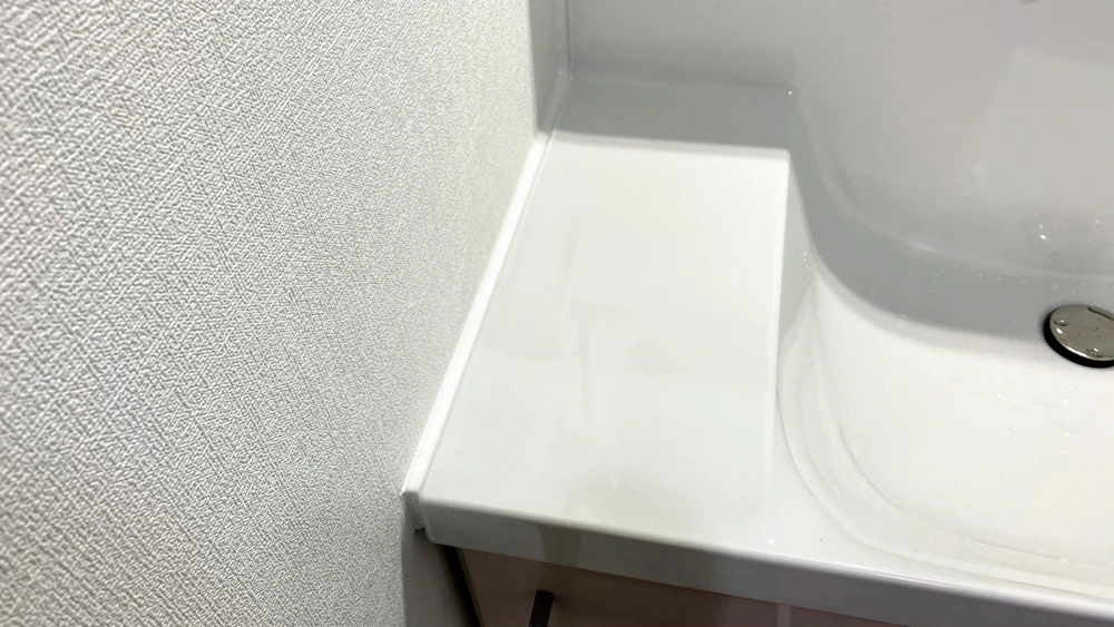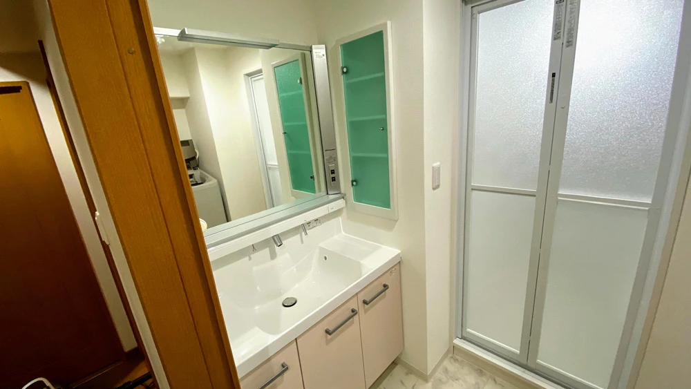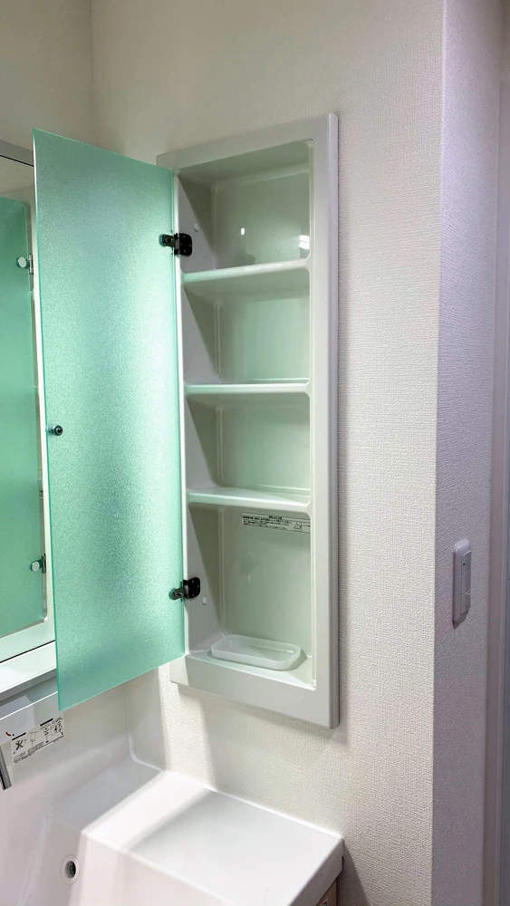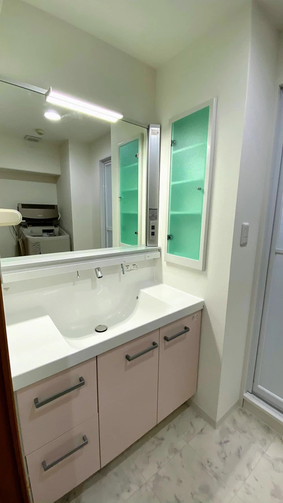 鏡はスッキリ一枚仕立てを選び、収納は横壁面に埋め込み収納を設置しました。より手元に近い場所の収納で、使い勝手がいいとご満足いただきました。