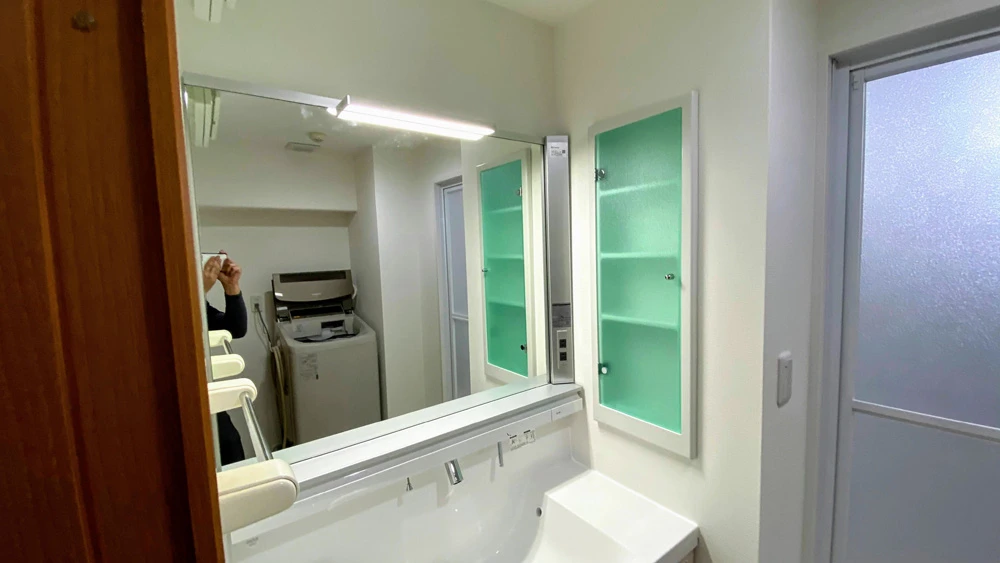 昨今、ほとんどの場合三面鏡のミラーを設置することが多いのですが、今回はデザインがスッキリし、出っ張りが少ない一面鏡のミラーを設置しました。