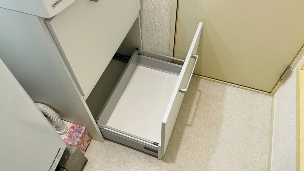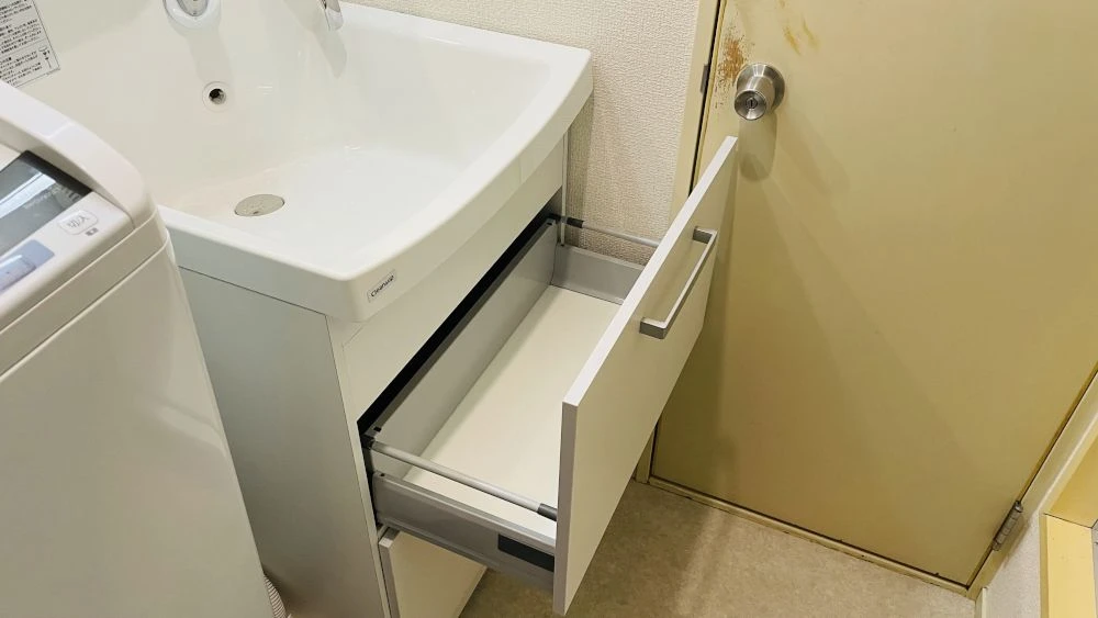 引き出し式収納や鏡面裏収納により、サイズは同じでもたっぷり収納できるようになったとご好評をいただきました。
