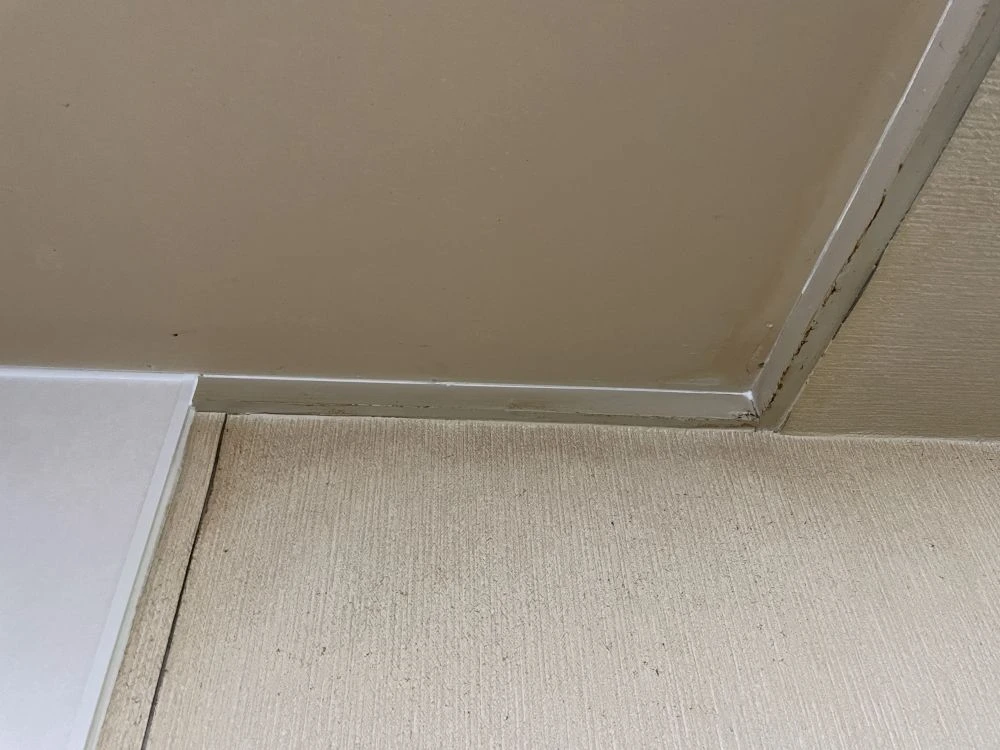 洗面台横から洗濯機パン下をぴったりのサイズで床上げし、元々ある巾木の色に塗装しました。