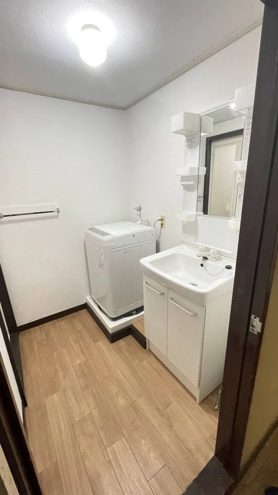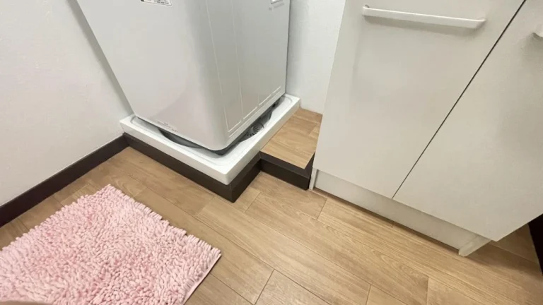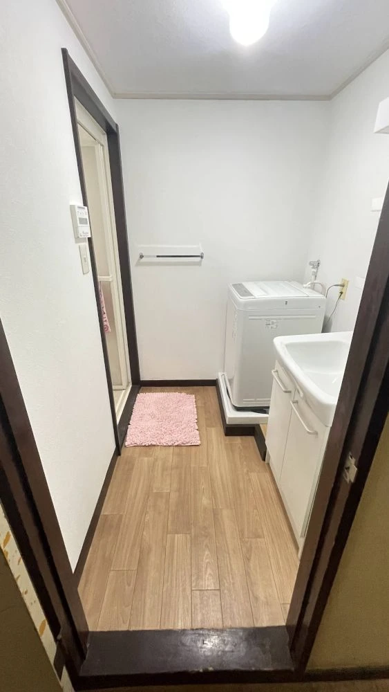 配管の都合で、洗面所横と洗濯機パン下は床を上げました。洗濯機パンや洗面台の形状に合わせ、オーダーメイドで仕上げました。もともとの巾木と色を揃えたので違和感もありません。