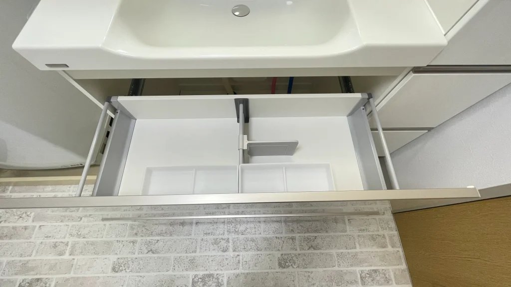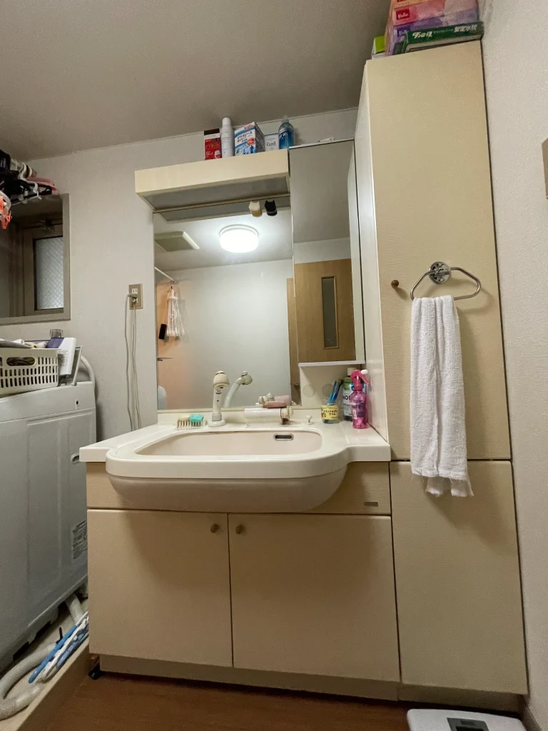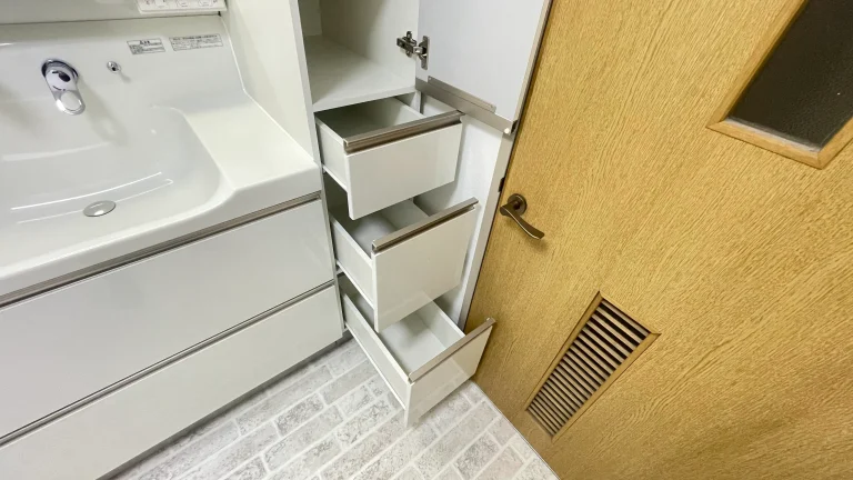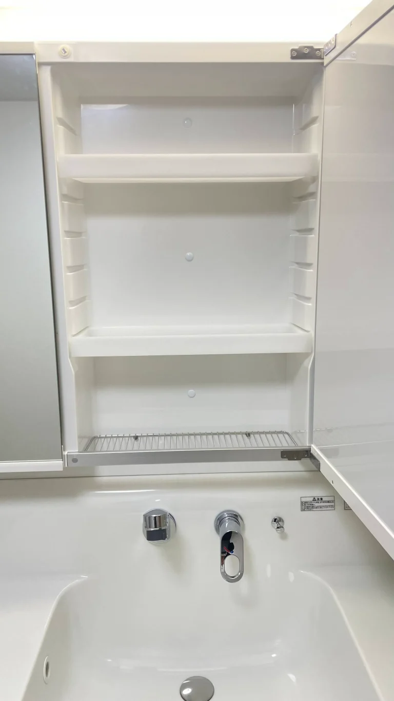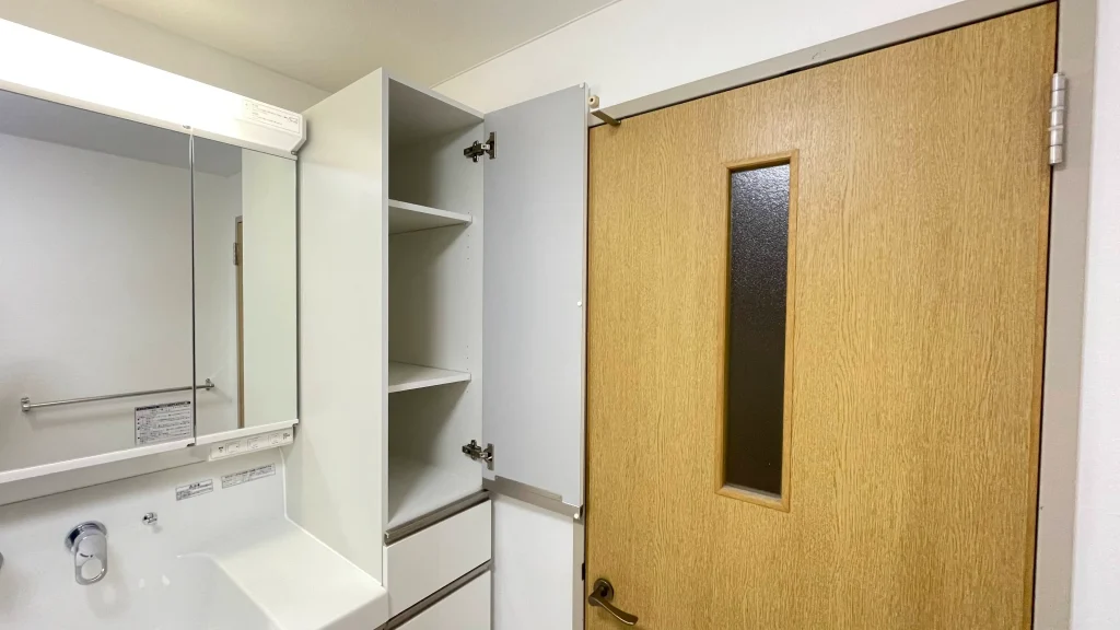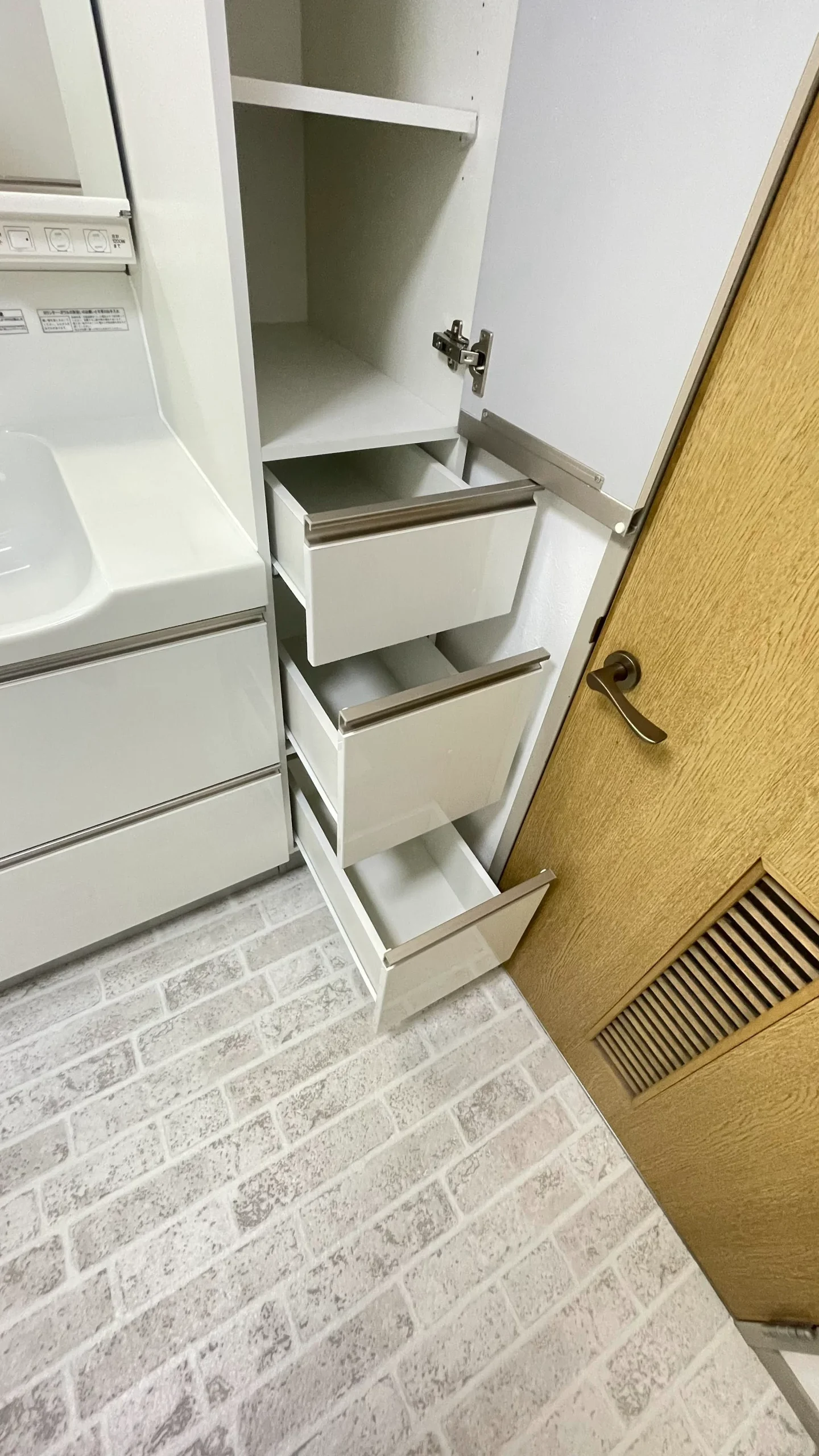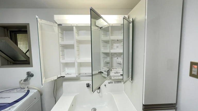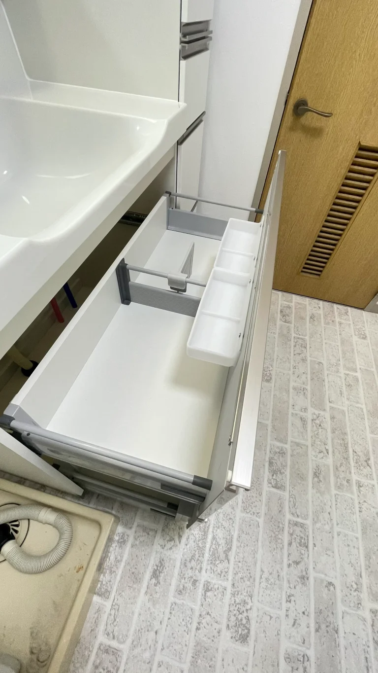 引き出しタイプの収納に、三面鏡、吊戸棚と充実の収納に加え、今回はトールキャビネットも横に設置されました。驚くほどの収納量です。