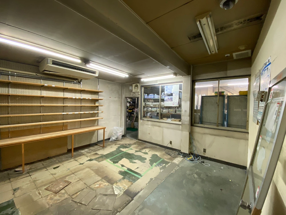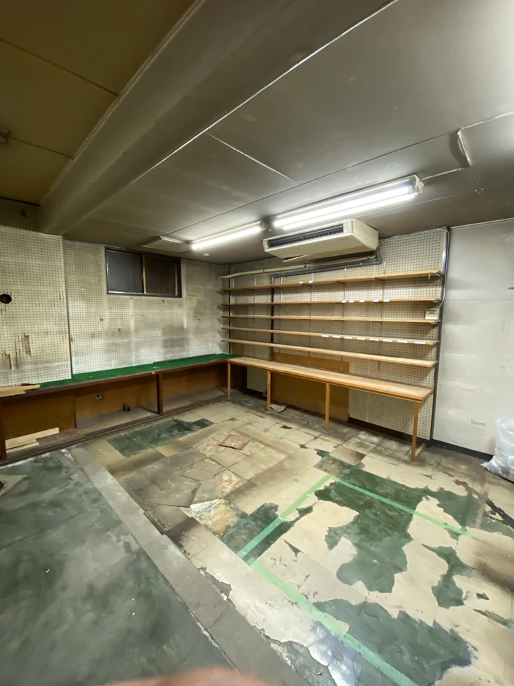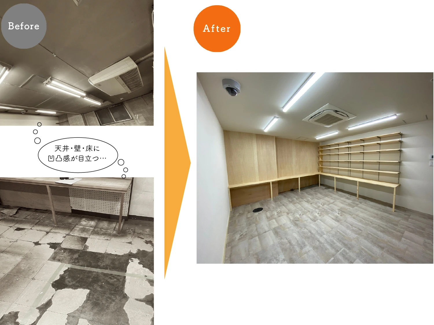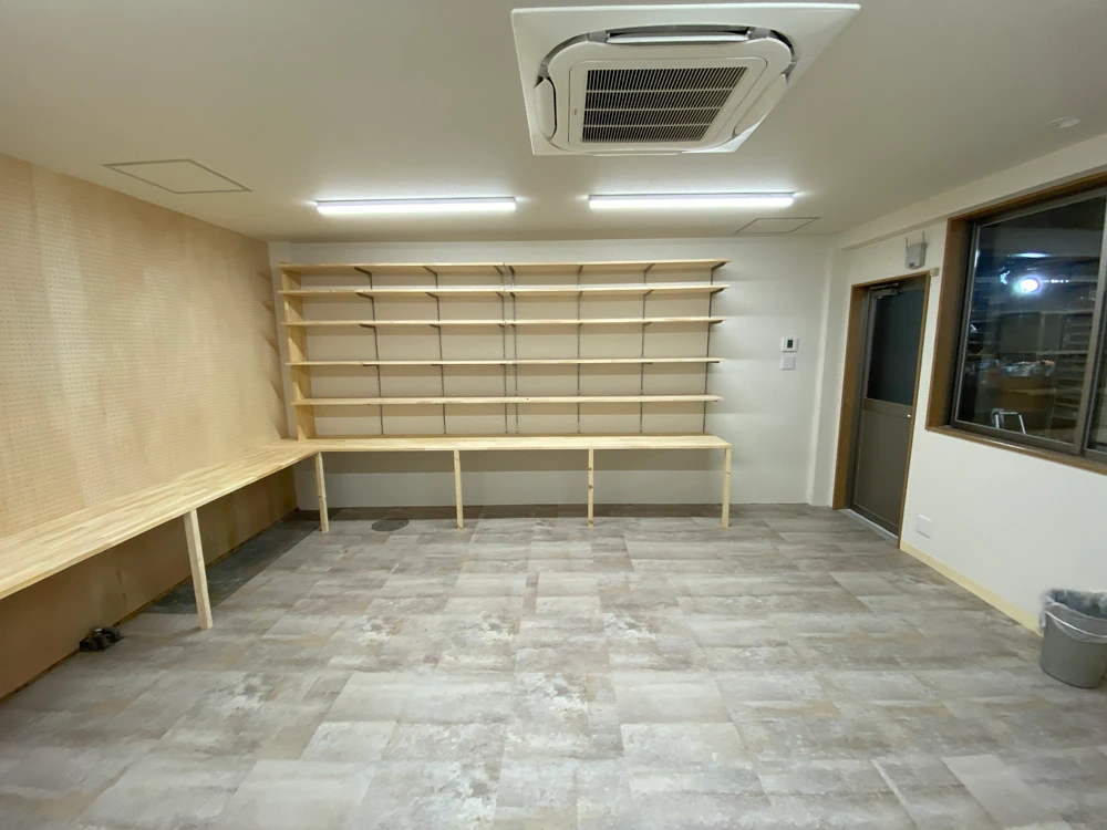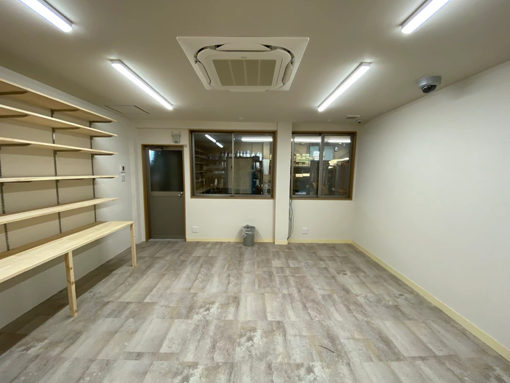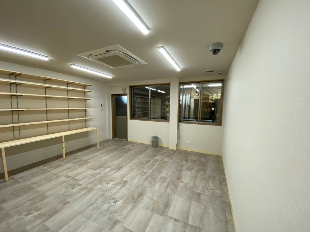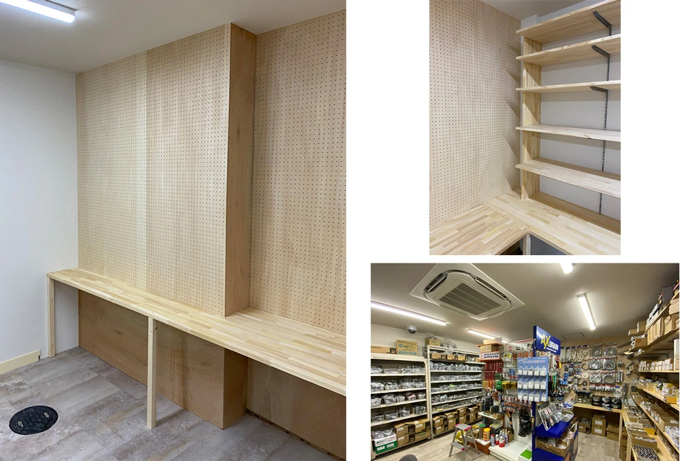 まず、天井・床・壁の三面とも凹凸感を解消する工事を行いました。その際、下地の工事に加え、エアコンも埋め込み式のものを選択しました。商品管理棚には有孔ボードを活用した収納システムを作り、空間を最大限に生かせるようにしました。