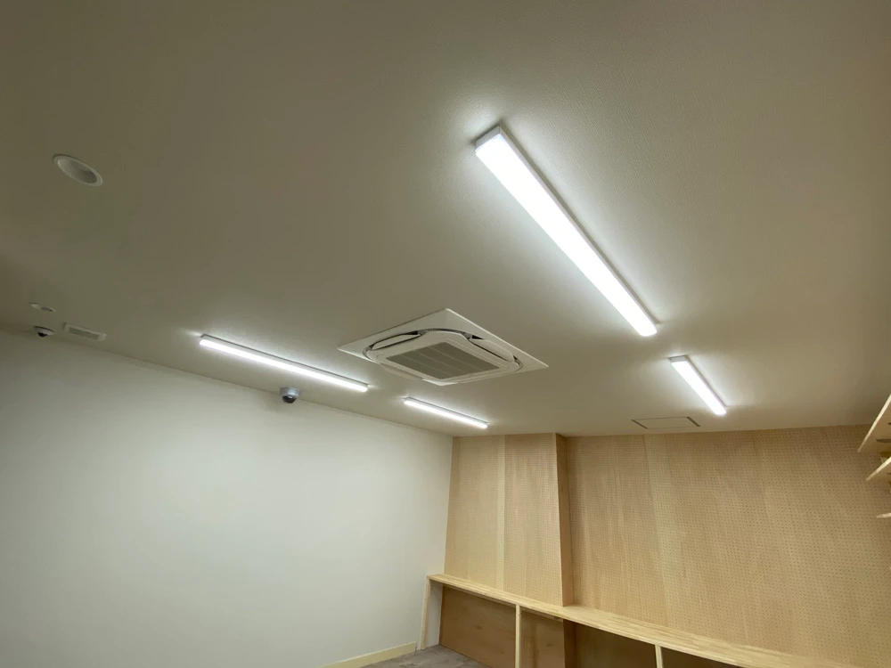 エアコンは天井埋め込み式のものにしました。埋め込むことですっきりしただけでなく、カビ臭さもなくなり、きれいな空気になりました。照明は全てLEDにして配置を見直すことで、明るくなりました。